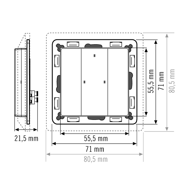 2-fach-Taster als zertifiziertes DALI-2-Eingabegerät. Individuelle Funktionszuweisung per Application Controller (DALI-2-Steuereinheit). Funktionsbelegungen der Tasten individuell kennzeichenbar. Spannungsversorgung durch DALI-Bus. Kompatibel mit 55-mm-Rahmen gängiger Hersteller.