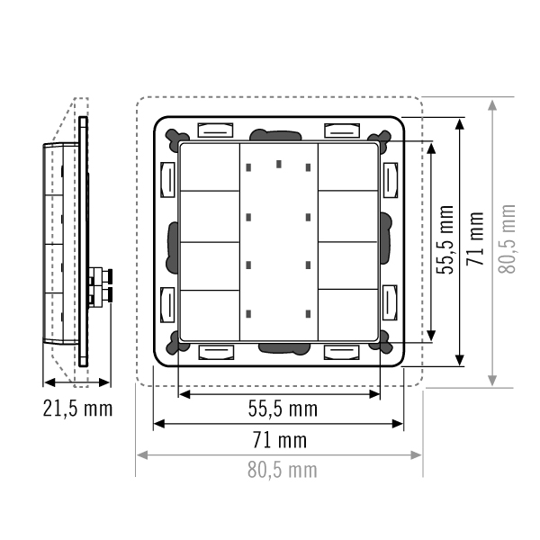 8-fach-Taster als zertifiziertes DALI-2-Eingabegerät. Individuelle Funktionszuweisung per Application Controller (DALI-2-Steuereinheit). Funktionsbelegungen der Tasten individuell kennzeichenbar. Spannungsversorgung durch DALI-Bus. Kompatibel mit 55-mm-Rahmen gängiger Hersteller.