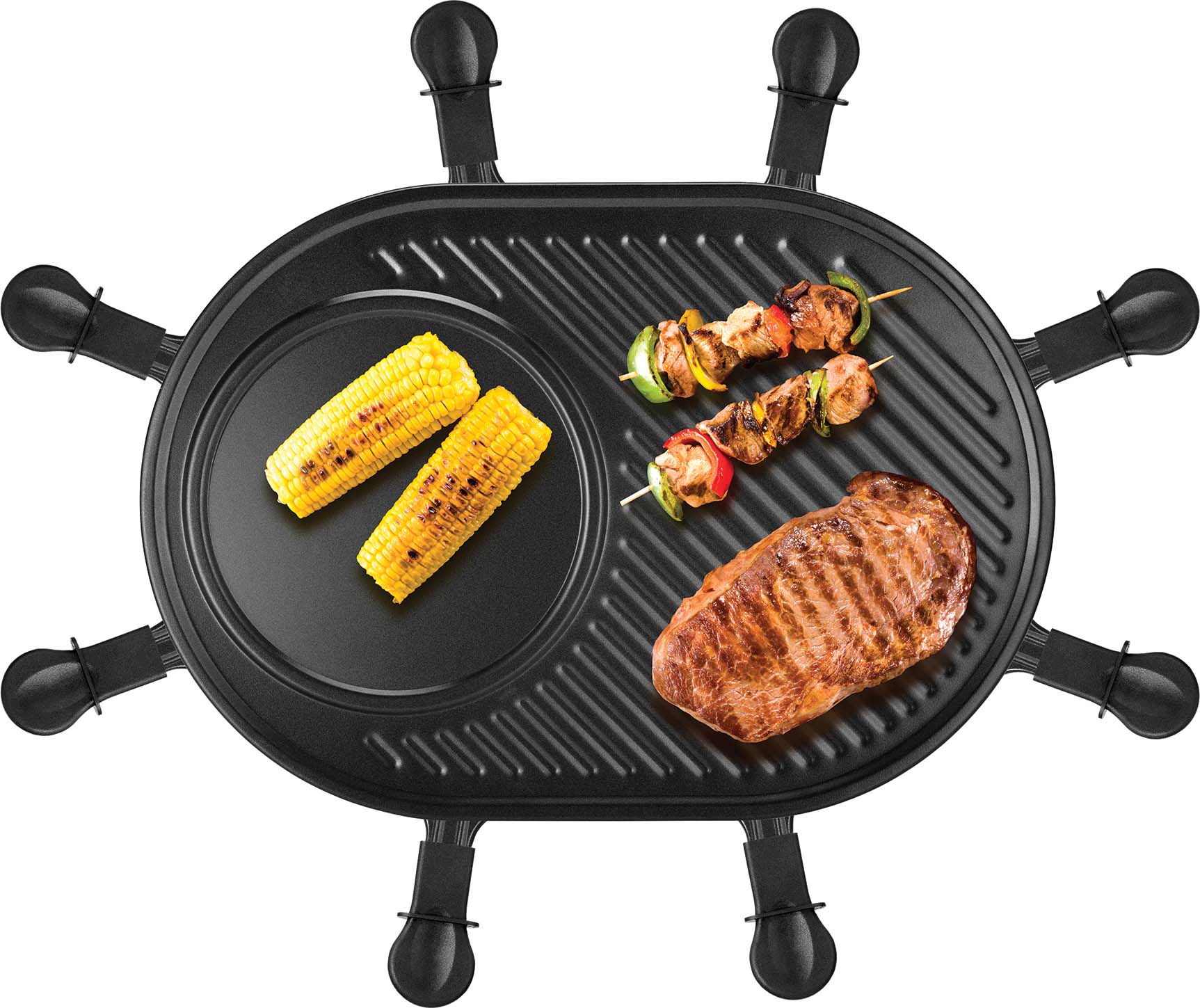 Raclette Gourmet, für bis zu 8 Personen, abnehmbare, antihaftbeschichtete Grillplatte mit glatter und geriffelter Oberfläche (ca. Ø 15,7 cm/ca. 37,9x25,8 cm), 8 antihaftbeschichtete Pfännchen mit wärmeisolierten Griffen, stufenlose Temperaturregelung mit Kontrollleuchte, Heizelement aus Edelstahl, Antirutschfüße, Leistung: 1200 W, 220-240 V~, 50/60 Hz, Gewicht: ca. 2,2 kg, Kabel: ca. 90 cm, Material: Metall/Kunststoff, inkl. Bedienungsanleitung mit Rezepten