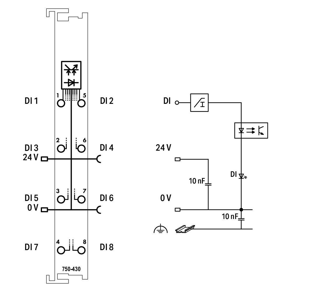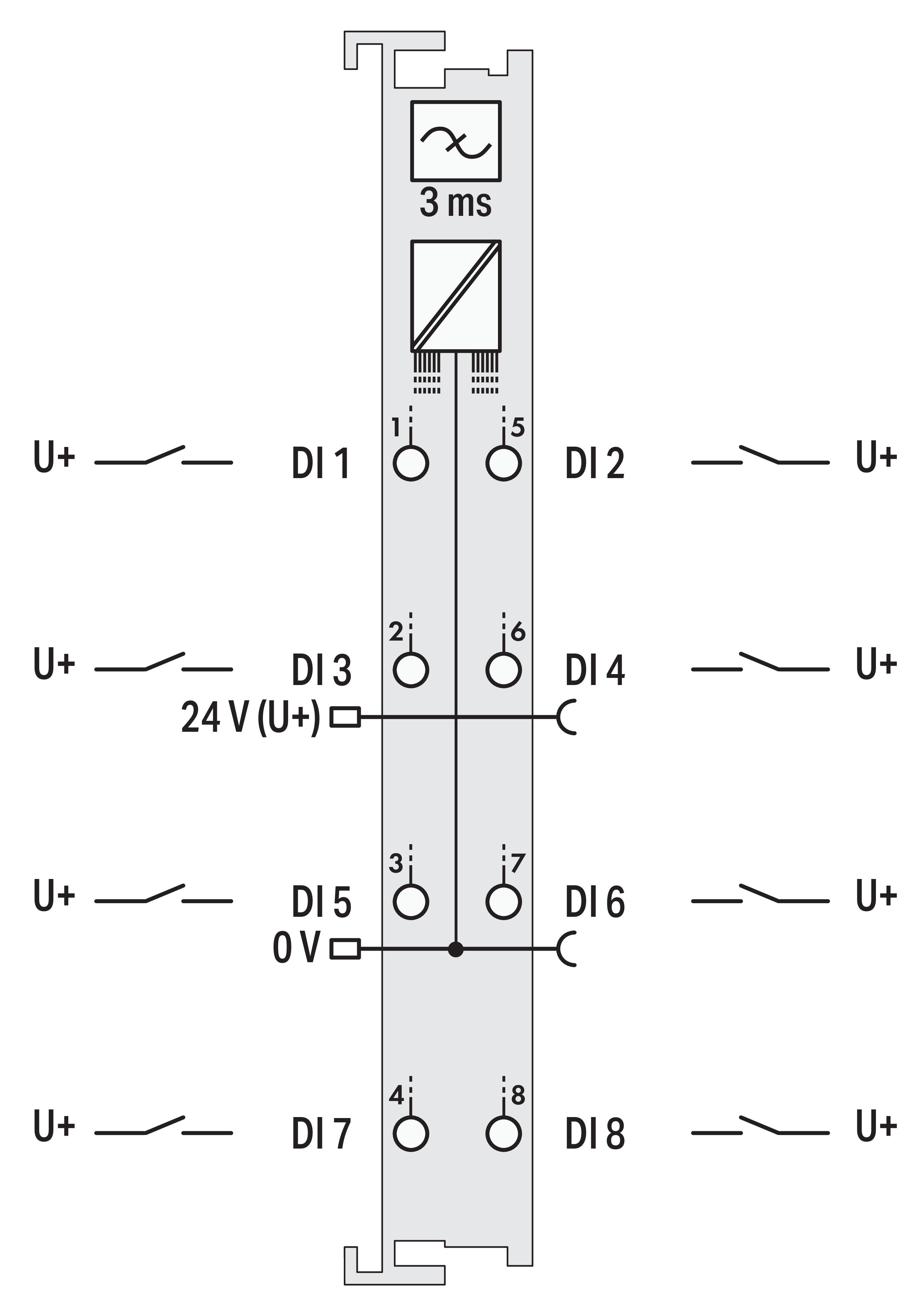 8-Kanal-Digitaleingang; DC 24 V; 3 msDas Digitaleingangsmodul verfügt bei nur 12 mm Baubreite über 8 Kanäle. Es erfasst Steuersignale aus dem Feldbereich, z.B. über Sensoren. Zur Störunterdrückung ist jedem Eingang ein Filter vorgeschaltet. Feld- und Systemebene sind galvanisch getrennt.- Hersteller-Artikelnummer (MPN)