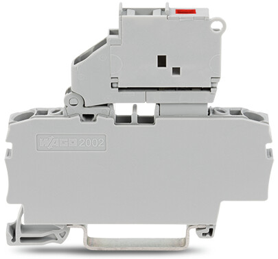 2-Leiter-Sicherungsklemme; mit schwenkbarem Sicherungshalter; mit Abschlussplatte; für G-Sicherungseinsatz 5 x 20 mm; mit Defektanzeige durch LED; 12 - 30 V; für Tragschiene 35 x 15 und 35 x 7,5; 2,5 mm²; Push-in CAGE CLAMP®; 2,50 mm²; grauSicherungsklemme Serie 2002 mit Push-in CAGE CLAMP®