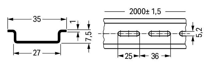 Stahltragschiene; 35 x 7,5 mm; 1 mm dick; 2 m lang; gelocht; entsprechend EN 60715; Lochbreite 25 mm; Lochabstand 36 mm; silberfarben