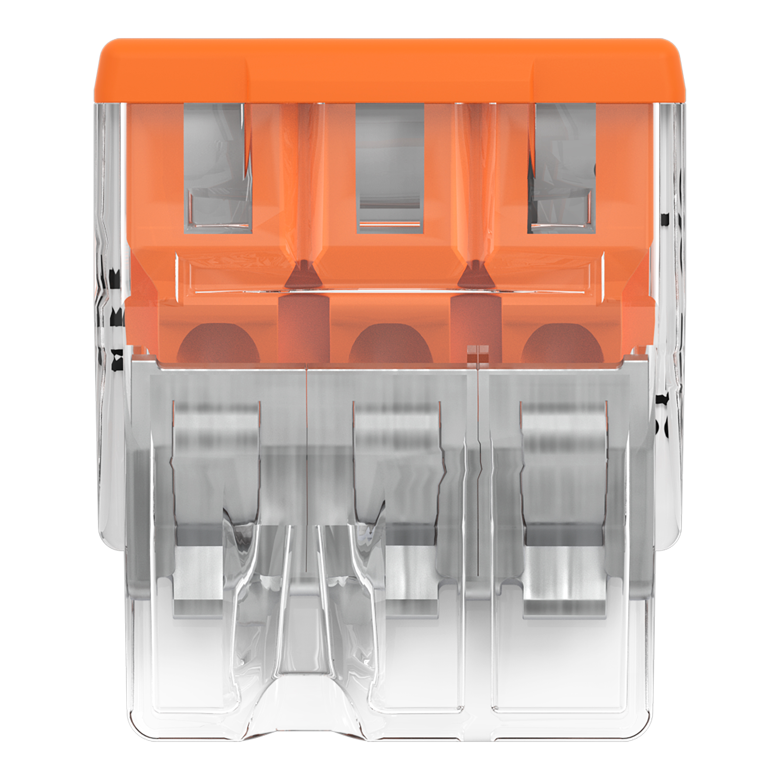 Verbindungsklemme zum Stecken; für eindrähtige Leiter; max. 2,5 mm²; 3 Leiter; Gehäusefarbe transparent; Deckelfarbe orange; Umgebungstemperatur max. 60 °C (T60); 2,50 mm²; transparent