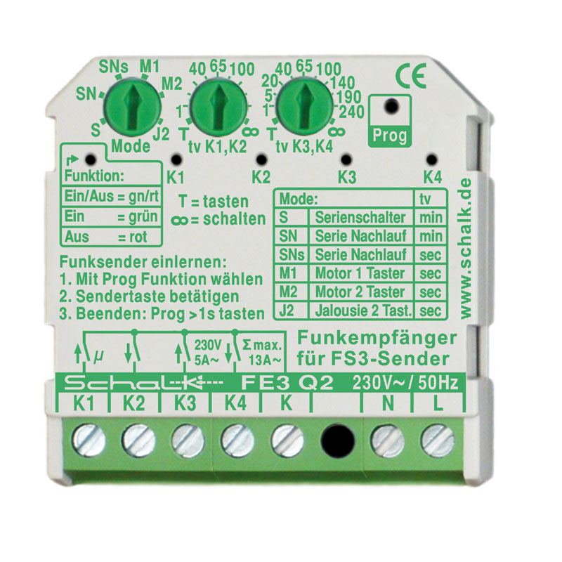 Der äußerst kompakte Funk-Empfängerschalter FE3 Q2 mit 4-Relais ermöglicht zusammen mit den Funksendern der FS3-Serie das drahtlose Schalten von elektr. Betriebsmitteln. Er ist als Serienschalter, zur Übertragung von Kontaktzuständen, oder zur Motor- und Jalousiesteuerung einsetzbar. Durch diverse einlernbare Funktionen lassen sich Funksender für Vorort-Steuerung oder für Gruppen-/Zentralsteuerung einlernen. 1- oder 2-Taster-Steuerung möglich. Mit vier leistungsstarken 5A-Relais ermöglicht der FE3 Q2 entweder das Schalten von 4 Einzelverbrauchern (z.B. Lampen, Lüfter, Pumpen, etc.) oder 2 Motoren mit je 2 Laufrichtungen wie Rollläden, Jalousien und Tore. Zusätzliche Zeitfunktionen ermöglichen ein automatisches Schalten nach Ablauf einer eingestellten (Nach-)Laufzeit.. Kompatible Produkte: Funksender FS3-Serie, Repeater FV2 R., Maße: 43x43x18.5mm, 230V AC, 4 Schließer 5A (gemeinsam potentialfrei)