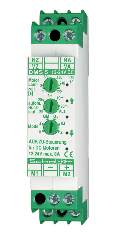 AUF/ZU-Steuerung für Gleichstrom-Motoren - mit Nebenstelleneingängen für Gruppen- und Zentralsteuerung, 12-24V DC. Das elektronische Steuergerät DMS 5 (Reiheneinbaugerät) ist eine universell einsetzbare DC-Motorsteuerung für Rechts-/Linkslauf. Es ist sowohl eine Ein- als auch eine Zweitaster-Motorsteuerung realisierbar. Durch die vorrangigen Nebenstelleneingänge ist es möglich, mehrere DMS 5 zu Gruppen- und Zentralsteuerungen zusammenzufassen. Die Motorlaufzeit kann zeitlich begrenzt werden um z.B. bei mechanischer Blockade den Motor nicht zu überlasten. Eine komfortable, automatische und einstellbare Schließfunktion verhindert u.a. ein unbeabsichtigtes Offenlassen eines Dachfensters. Bei Jalousiesteuerung können die Lamellen exakt verstellt, oder nach dem Abschalten automatisch auf einen bestimmten Winkel rückgestellt werden., Maße: 18x55mm, 12-24V DC - 2 Schließer 8A