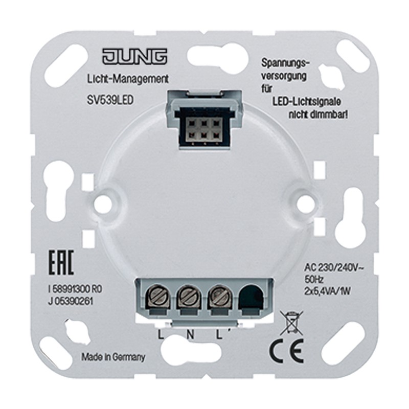 (Schraubbefestigung, ohne Befestigungskrallen) Das "Netzteil" dient ausschließlich zur Spannungsversorgung der LED-Lichtsignale (Art.-Nr. ..539..). Es ist nicht dimmbar. Nennspannung: AC 230 ... 240 V ~ Netzfrequenz: 50 Hz Umgebungstemperatur: 0 ... +40 °C Anschlüsse: L, N, L' Schutzklasse (bei montiertem Aufsatz): II Leistungsaufnahme (bei montiertem Aufsatz): typ. 2 x 5,4 VA / 2 x 1,0 W Anschluss Schraubklemmen Max. klemmbarer Leiterquerschnitt: 2 x 2,5 mm2 oder 1 x 4 mm2- Hersteller-Artikelnummer (MPN)