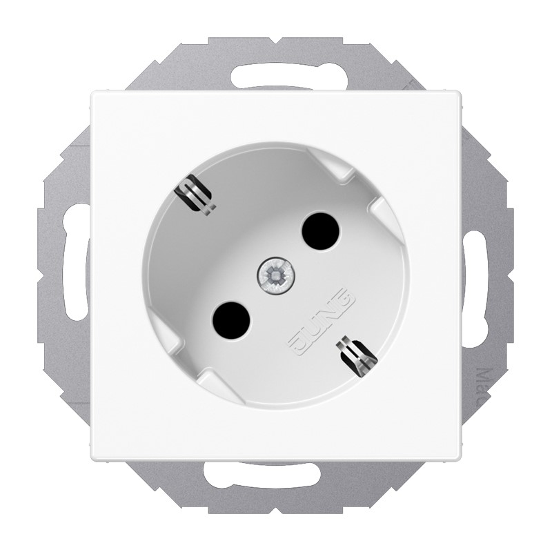 Schutzkontakt®-Steckdose 45°, alpinweiß mit integriertem erhöhten Berührungsschutz (Safety Plus) mit Federklemmen für starre Leiter bis 2,5 mm2 Verbindungsklemmen nach DIN VDE 0620 besonders geeignet für vertikale Kombination mehrerer Steckdosen ohne "Befestigungskralle": Art.-Nr. mit "N", z.B. ..520-45 N.. Material: Duroplast Maße (B x H): 55 x 55 mm