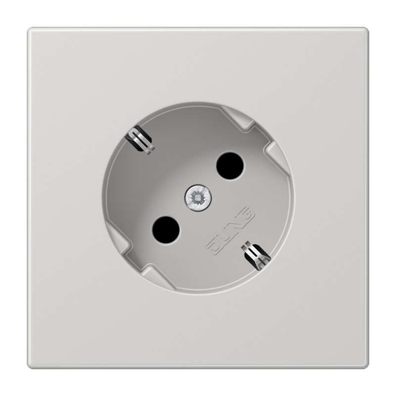 Schutzkontakt®-Steckdose 45°, lichtgrau mit Federklemmen für starre Leiter bis 2,5 mm2 Verbindungsklemmen nach DIN VDE 0620 besonders geeignet für vertikale Kombination mehrerer Steckdosen ohne "Befestigungskralle": Art.-Nr. mit "N", z.B. ..520-45 N.. Material: Duroplast Maße (B x H): 70 x 70 mm