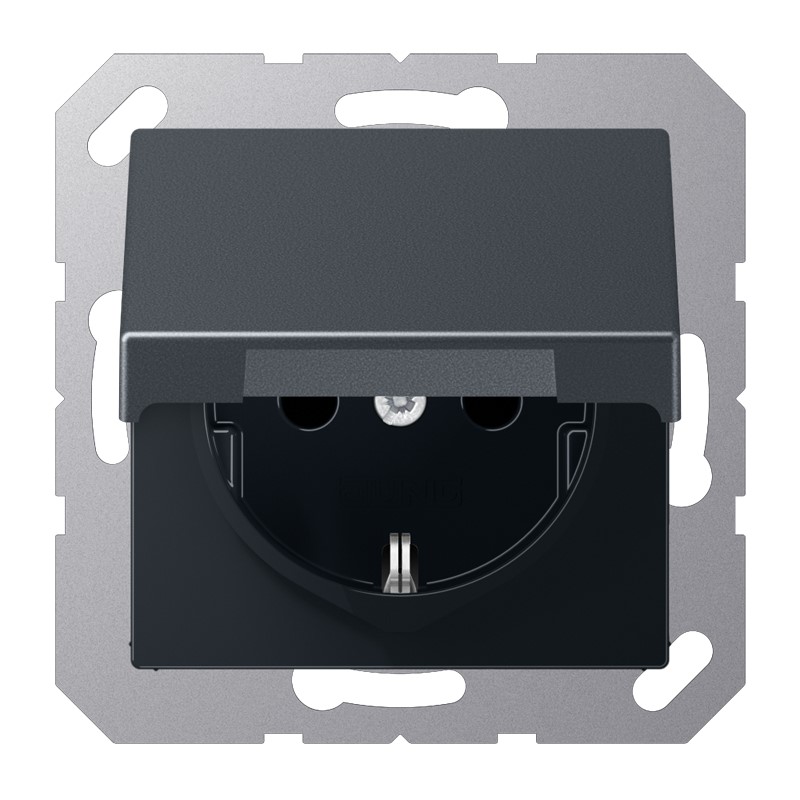 Schutzkontakt®-Steckdose, anthrazit matt mit Klappdeckel (mit Rückstellfeder) mit Schraubklemmen für starre und flexible Leiter bis 2,5 mm2 Verbindungsklemmen nach DIN VDE 0620 Tragring, Krallen und Krallenschrauben sind über eine Erdungsschiene in die Schutzmaßnahme eingebunden. Material: Thermoplast lackiert Maße (B x H): 55 x 55 mm