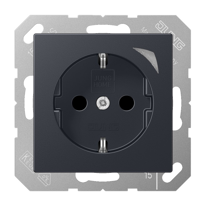 JUNG HOME Schutzkontakt® Steckdose, anthrazit matt mit integriertem erhöhten Berührungsschutz (Safety Plus) mit Schraubklemmen für starre und flexible Leiter bis 2,5 mm2 Verbindungsklemmen nach DIN VDE 0620 Tragring, Krallen und Krallenschrauben sind über eine Erdungsschiene in die Schutzmaßnahme eingebunden. Bestimmungsgemäßer Gebrauch Manuelles oder automatisches Schalten von Beleuchtung und haushaltsüblichen Geräten Drahtlose Verknüpfung mit Geräten des JUNG HOME Systems Einsatz im trockenen Innenbereich Montage in Gerätedose mit Abmessungen nach DIN 49073 Tiefe der Gerätedose (Innenmaß): min. 53 mm Produkteigenschaften Inbetriebnahme und Bedienung über JUNG HOME App mit mobilem Endgerät (Smartphone oder Tablet) über Bluetooth® Taste zum Schalten Mehrfarbige Statusanzeige mit optionalem Nachtmodus Sperren der lokalen Bedienung Bis zu 16 Zeitprogramme Ein-/ Ausschaltverzögerung Einbindung der Last in Bereiche (Gruppen), Zentralfunktionen und Szenen Automatikfunktionen aktivieren/deaktivieren über JUNG HOME App Sperr- und Zwangsführung: Dauer-EIN/AUS oder für feste Zeit EIN/AUS Automatische Datum- und Uhrzeitaktualisierung bei Verbindung mit mobilem Endgerät Zeitprogramme mit Sonnenauf- bzw. Sonnenuntergang (Astrotimer) Integrierter Schaltaktor mit 16 A Bluetooth® Mesh für voll verschlüsselte drahtlose Kommunikation und Repeaterfunktion Updatefähig über JUNG HOME App Material: Thermoplast lackiert Maße (B x H): 55 x 55 mm- Hersteller-Artikelnummer (MPN)
