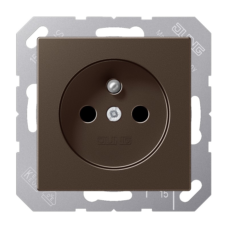 Steckdose, französisch/belgisches System, mokka 2-polig mit Erdungsstift, 16 A 250 V ~ CEE 7/5 mit integriertem erhöhten Berührungsschutz (Safety Plus) mit Federklemmen für starre und unbehandelte flexible Leiter bis 2,5 mm2 Tragring, Krallen und Krallenschrauben sind über eine Erdungsschiene in die Schutzmaßnahme eingebunden. Material: Duroplast lackiert Maße (B x H): 55 x 55 mm