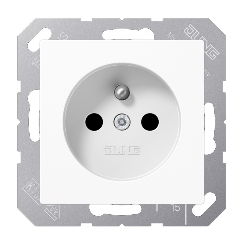 Steckdose, französisch/belgisches System, alpinweiß 2-polig mit Erdungsstift, 16 A 250 V ~ CEE 7/5 mit integriertem erhöhten Berührungsschutz (Safety Plus) mit Schraubklemmen für starre und flexible Leiter bis 2,5 mm2 nach NFC 61-314 Tragring, Krallen und Krallenschrauben sind über eine Erdungsschiene in die Schutzmaßnahme eingebunden. Material: Duroplast Maße (B x H): 55 x 55 mm