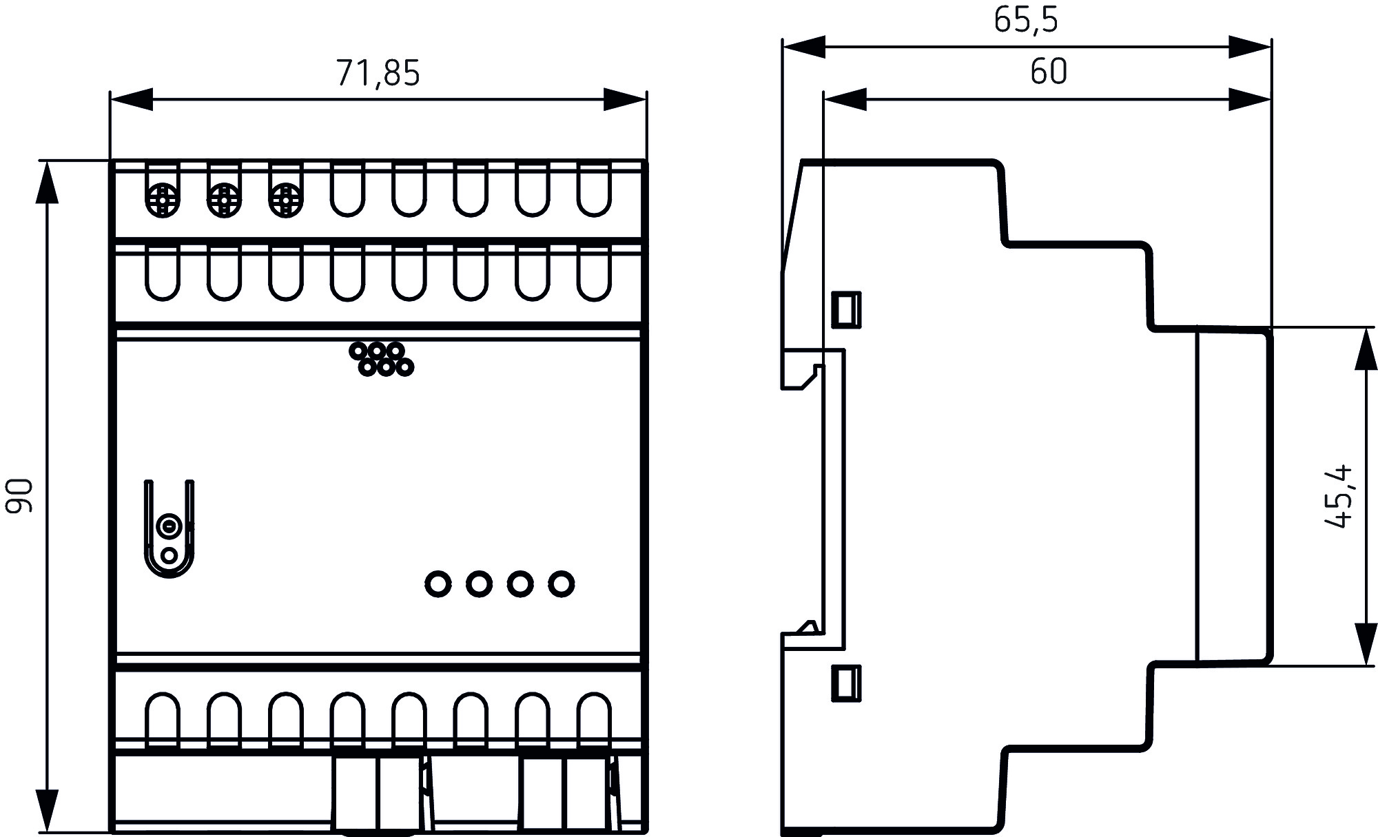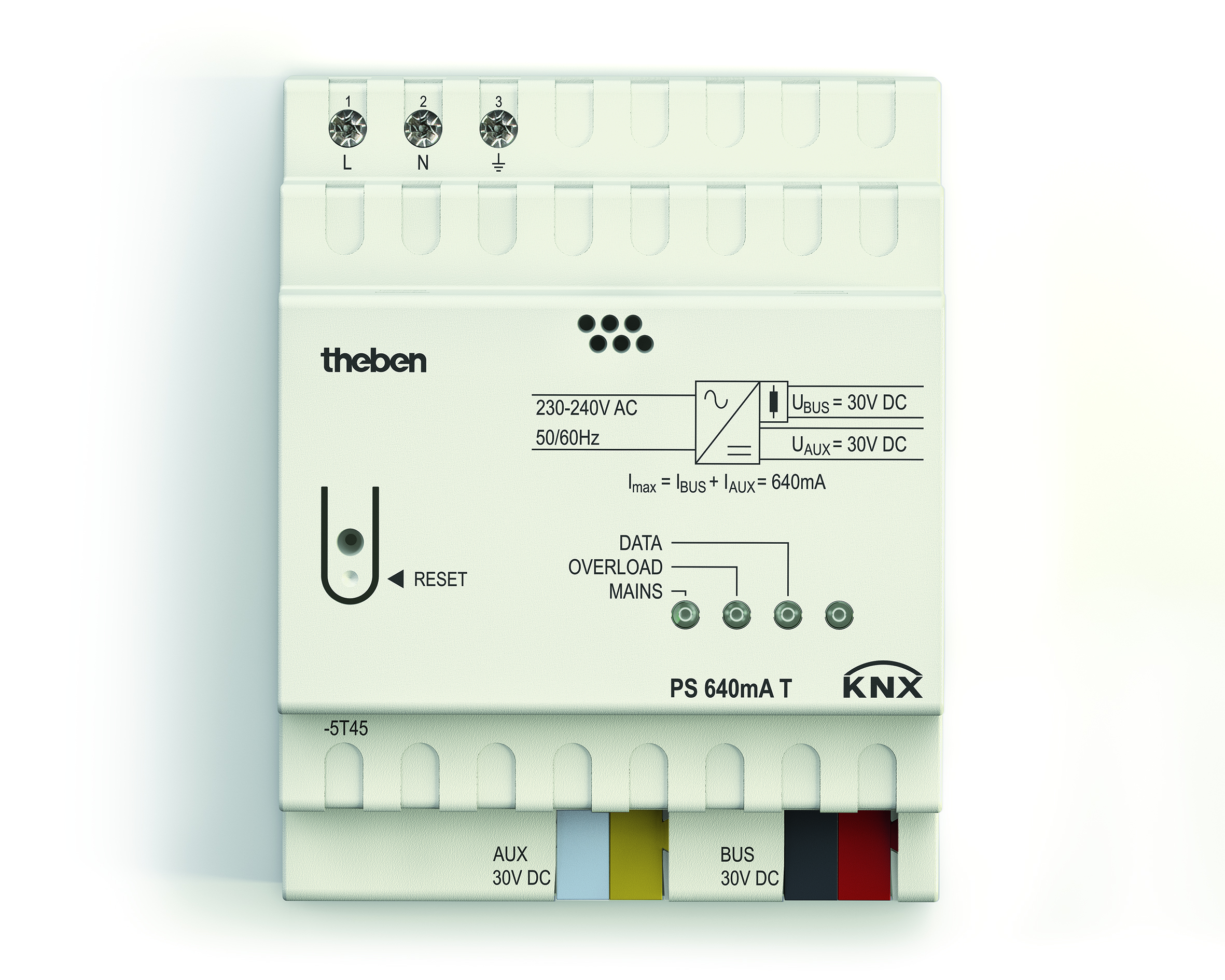 640 mA Spannungsversorgung KNX, mit integrierter Drossel wird die Buslinie von der KNX-Spannungsversorgung entkoppelt, mit Resetfunktion (20 Sek.), Anschluss der Spannungsversorgung 30 V DC über Busklemme, zusätzlicher Hilfsspannungsanschluss 30 V DC