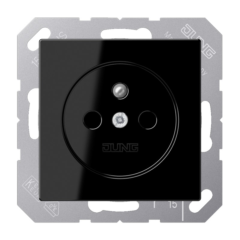 Steckdose, französisch/belgisches System, schwarz 2-polig mit Erdungsstift, 16 A 250 V ~ CEE 7/5 mit integriertem erhöhten Berührungsschutz (Safety Plus) mit Federklemmen für starre und unbehandelte flexible Leiter bis 2,5 mm2 Tragring, Krallen und Krallenschrauben sind über eine Erdungsschiene in die Schutzmaßnahme eingebunden. Material: Duroplast Maße (B x H): 55 x 55 mm