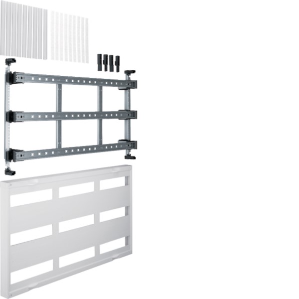 Verteilerbaugruppe univers N, Maße 450x750mm, für waagerechte Montage von Reiheneinbaugeräten. Bietet Platz für 9x12 Platzeinheiten. Geeignet für Schaltgerätekombinationen, Bemessungsspannung 3 Wechselstrom 690 Volt /50 Hertz. Ausgestattet mit plombierbaren Berührungsschutzabdeckungen, verstärkt durch Gasinnendruckverfahren und Schnellverschlussbolzen. Konform mit DIN EN 61 439 -1, -2, -3 und VDE 0660 Teil 600 -1, -2, -3. Maßnorm: DIN 43 870.