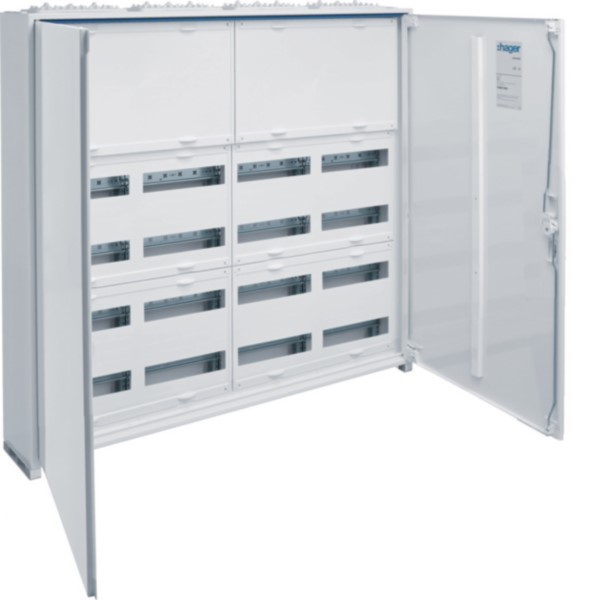 Feldverteiler nach DIN EN 61 439-1/-3 mit Maßnorm nach DIN 43 870 ausgestattetmit Platz für Geräte bis 125 A. Die Luft- und Kriechstrecken entsprechen DIN EN 60664-1. Der Schrank ist ab einer Breite von 800 mm (3-feldig) mit zweitüriger Aufbauoption erhältlich. Tragschienen profiliert und die obersten zwei Reihen verfügen über 15 mm hohe Hutschienen für Reihenklemmen in 150 mm Abstand und geschlossener Abdeckung. Die unteren Reihen sind für 7,5 mm hohe Hutschienen in 150 mm Mittenabstand.