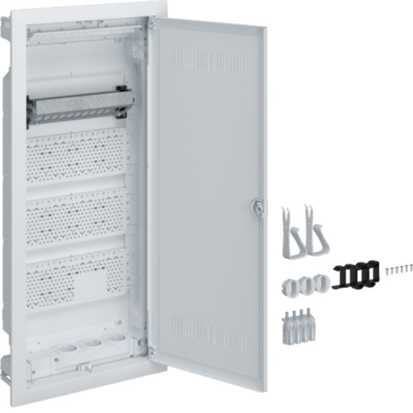 Der VH48WWH ist ein 4-reihiger Volta Multimedia Verteiler mit geschlitzter Kunststofftür für die Hohlwandmontage. Zertifiziert nach DIN VDE 61439-3 ist er mit Schutzart IP30 und Schutzklasse II für den Einsatz in Wohngebäuden nach DIN 18015 und für den Einbau von schutzisolierten VDI-Komponenten geeignet. Die Hohlwandmontage des Kunststoff-Mauerkastens mit serienmäßigem Leitungsabfang und ausbrechbarem Kabeleinführschieber ist seitlich oder oben/unten möglich.