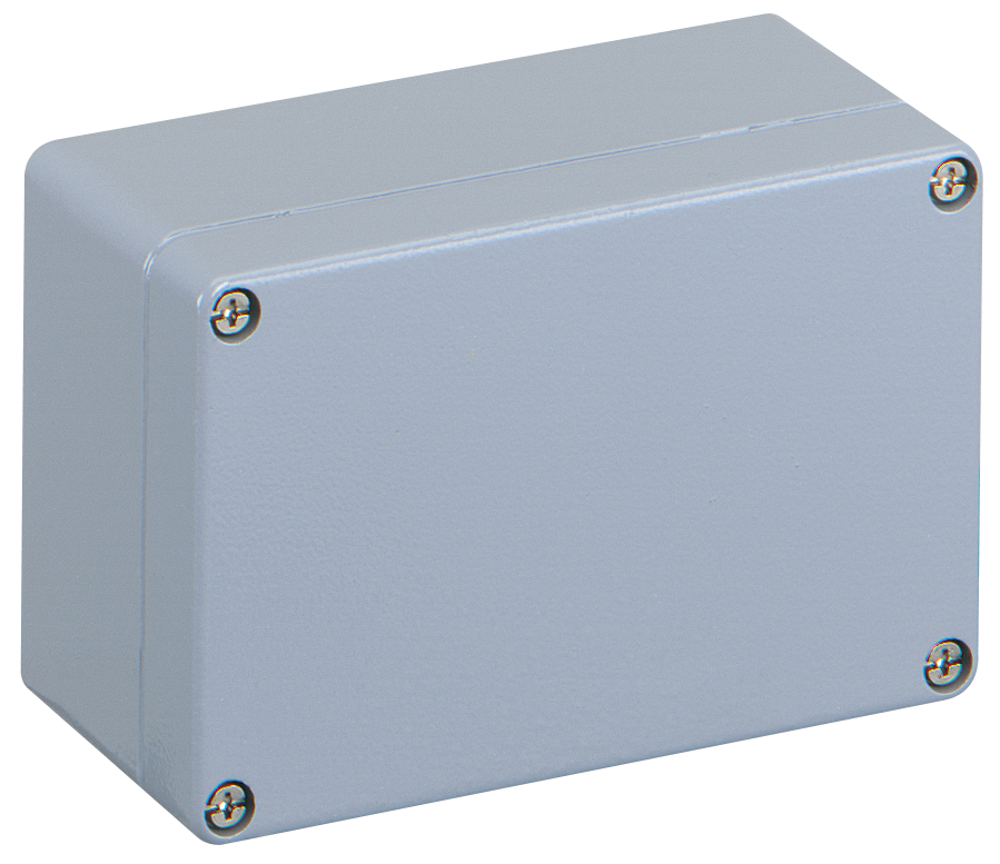Leergehäuse, mit Schutzart IP66, Aluminium pulverlackbeschichtet, innenliegende Befestigungsstellen, für Installationen im industriellen Umfeld und geschütztem Außenbereich, Kasten: Aluminium pulverlackbeschichtet, Deckel: Aluminium pulverlackbeschichtet, silbergrau, glatte SeitenwändeAbmessungen: 125 x 80 x 57mm
