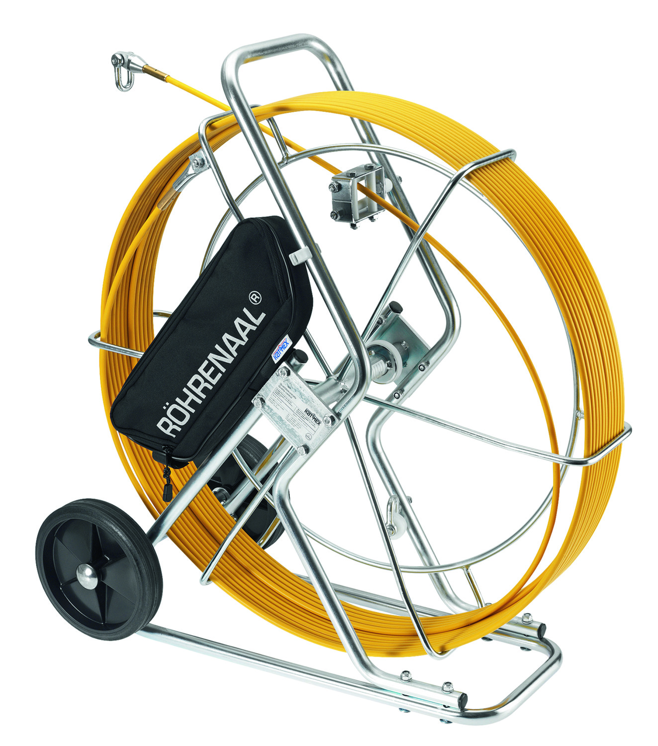 Katimex®Röhrenaal® - Das Kabeleinziehsystem für die Erdverkabelung, verzinktes Stahlrohrgestell, auf Rollen fahrbar, kugelgelagerte Haspel mit integrierter Feststellbremse, komplett mit Glasfaserstab, 2 Anfangshülsen M12, Anfangsbirne mit einem Ø 25 mm, Schäkel, 1 Verbindungs- und 4 Spannhülsen, 1 Spezialkleber 20 g, und Servicetasche,, Länge: 120 m.