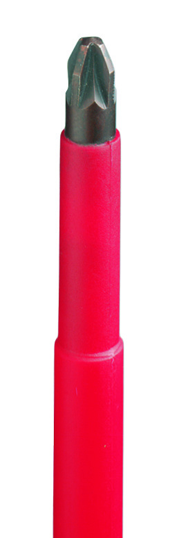 1.000 V isolierter VDE-Kreuzschlitz-Schraubendreher Pozidriv DIN EN 60900, Klassifikation VDE 0682, Teil 201, DIN ISO 8764. Stückgeprüft im Wasserbad mit einer Prüfspannung von 10.000 Volt. Ausführung: PZ1x80 mm; Größe: 185 mm