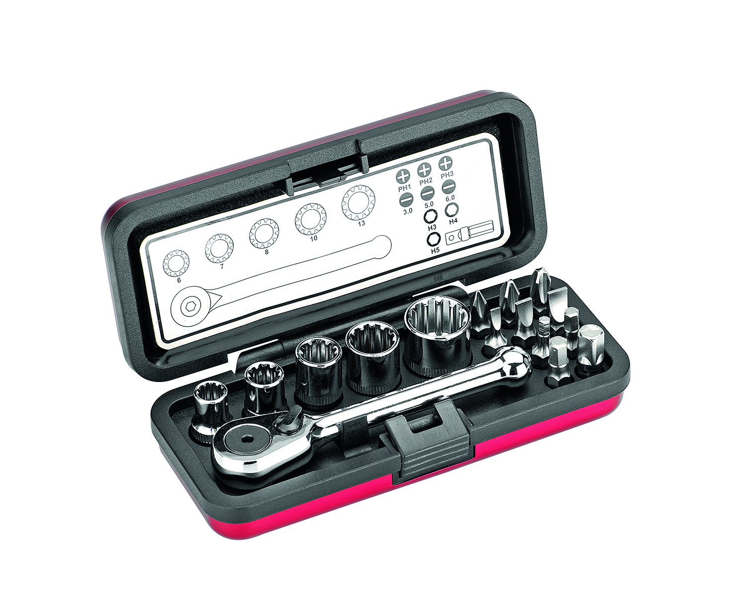 Steckschlüssel-Bit-Box, 16-teilig, in einer stabilen Aluminiumkassette. Sechskant-Bit_Einsätze und Vierkant-Steckschlüssel-Einsätze, Adapter zur Aufnahme von Steckschlüsseleinsätzen, aus Chrom-Vanadium-Stahl, poliertverchromt. Lieferumfang: Mini-Umschaltknarre mit Innensechskantantrieb, 1/4''-Adapter zur Aufnahme von Steckschlüsseln, Steckschlüssel SW 7 - 8 - 10 - 11 - 13 mm, je ein Bit 1/4'', 25 mm lang: für Schlitzschrauben 3 - 5 - 6 mm, für Kreuzschlitzschrauben PH 1 - PH 2 - PH 3, für Innensechskant 3 - 4 - 5 mm