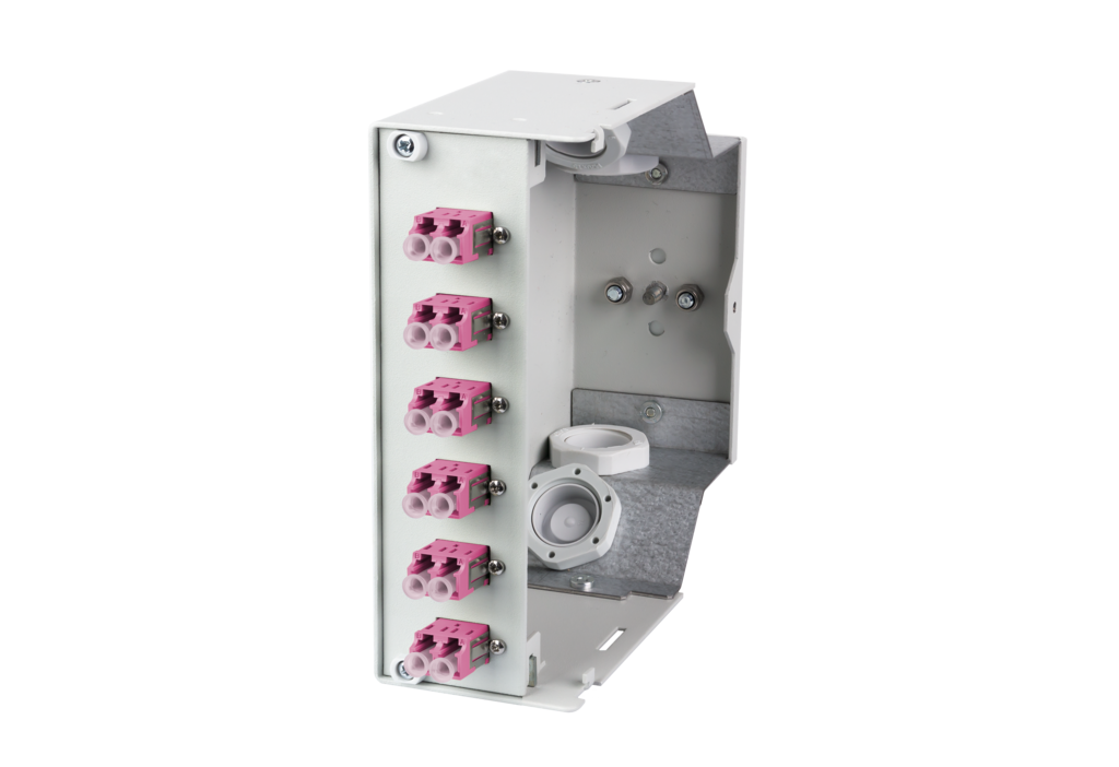 Kompaktes Verteilergehäuse für TH35-Tragschienensysteme, Vorbereitet zur Installation von Vorkonfektionierten Installationskabeln (VIK), für VIKs mit Universal- oder Breakoutkabeln mit maximal 12 Fasern geeignet, für VIKs mit Mini-Breakoutkabeln mit maximal 24 Fasern geeignet, bestückt mit LC-D Kupplungen, Frontbereich mit Beschriftungsstreifen, Verschiedene Montagepositionen am Hutschienensystem möglich, Kabelzuführung von oben oder unten, gerade oder schräg, mit M20-Verschraubung (bis zu 2 möglich), Gehäuse aus Stahlblech, pulverbeschichtet (lichtgrau, RAL 7035), Varianten: bestückt mit LC-D Kupplungen jeweils in blau (OS2), grün (OS2 APC), erikaviolett (OM4), aqua (OM3) oder lindgrün (OM5)