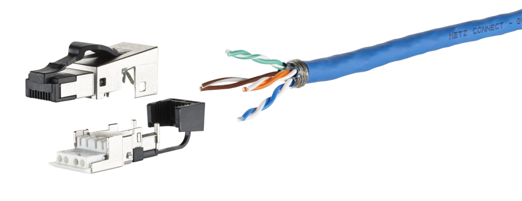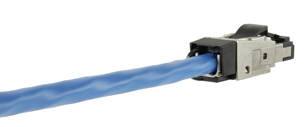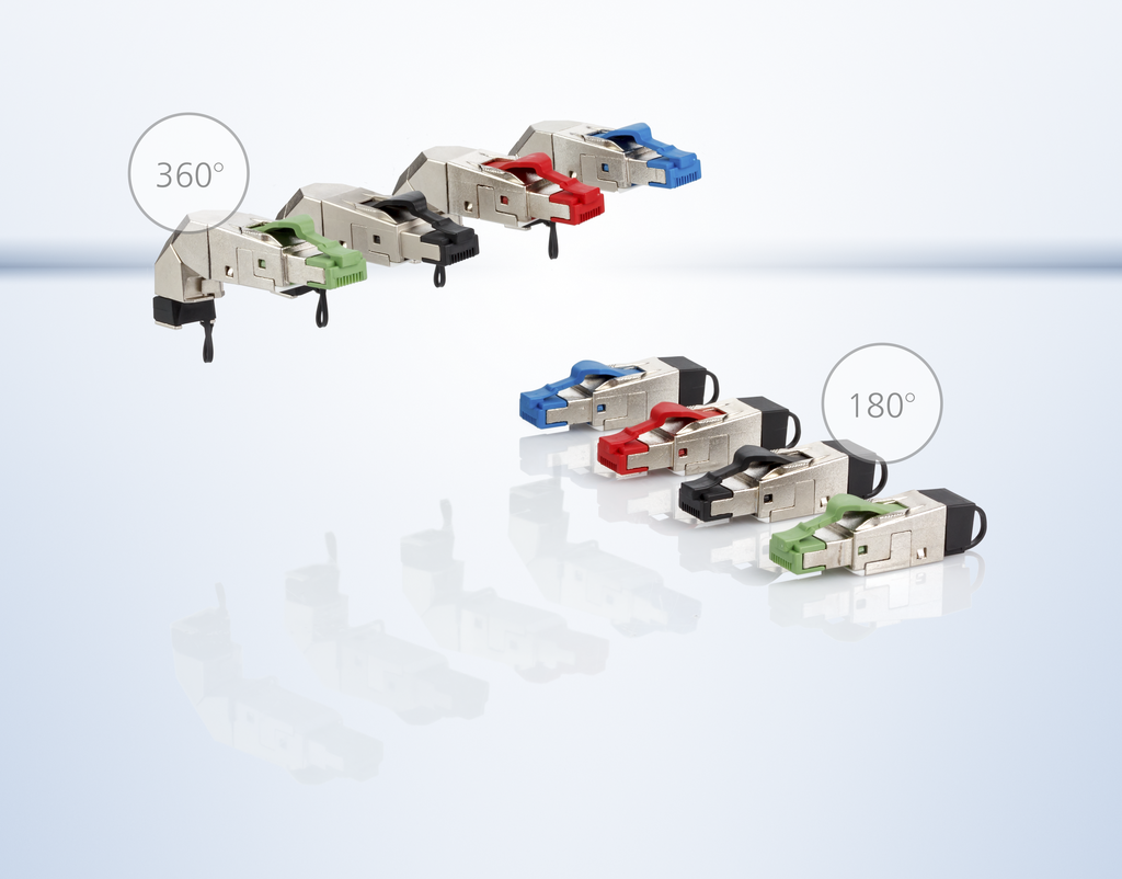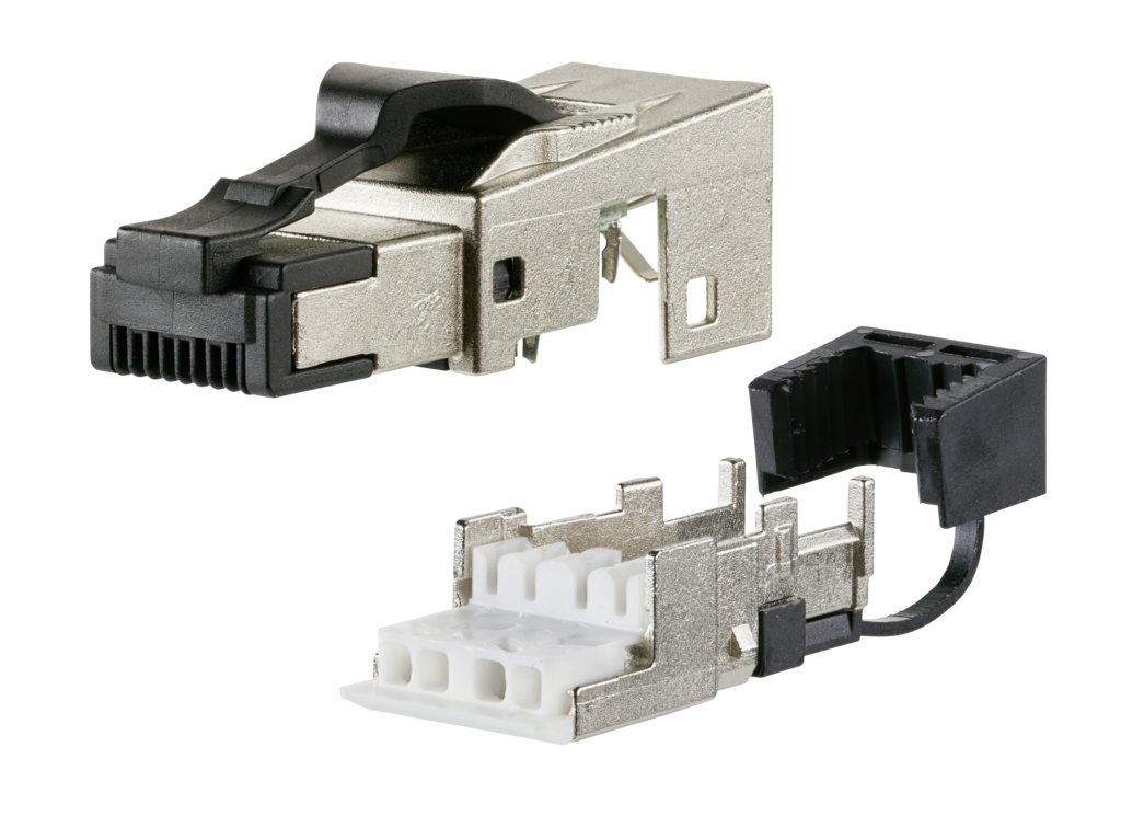 Feldkonfektionierbarer RJ45-Stecker Cat.6, A/Klasse EAvollgeschirmt und multiportfähig, Kabelzuführung gerade (180°), einfachste Konfektion - ohne Spezialwerkzeug anschließbar, Adernanschluss Litzenleiter AWG 27/7 - 22/7, Aderdurchmesser 0,46 - 0,76 mm, Adernanschluss Vollader AWG 26/1 - 22/1, Aderdurchmesser 0,409 - 0,64 mm, Übertragungstechnische Eigenschaften Cat.6, A nach ISO/IEC 11801Einhaltung der Klasse E, A nach ISO/IEC 11801, DIN EN 50173-1Schutzart IP20, geeignet für Kabelmanteldurchmesser von 5,5 bis 9,5 mm, 2-teiliges, industrietaugliches Gehäuse aus Zinkdruckguss, Zugentlastung per Rastclip direkt am Ladestück, geschützter Verriegelungshaken, wiederanschließbar