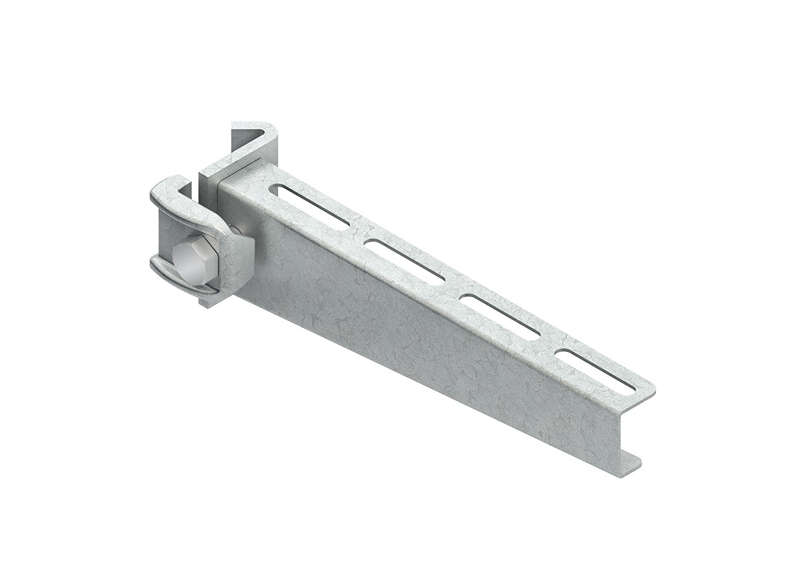 Ausleger, standard, mit vormontierter Klemme, zur Hängestielmontage, einschließlich galvanisch verzinkten anteilmäßigem Befestigungszubehör, erforderliches Befestigungszubehör für Kabelleitern bitte gesondert bestellen. Die Tragfähigkeitsangaben gelten nur bei ausreichender Verankerung mit dem tragenden Untergrund bzw. bei vorschriftsmäßigen Montagen an Hängestielen. VDE zertifiziert! für Profil : I 80/... für Hängestiel : HI 80/... für Wandanschlusslasche : WKTT 100 Abmessungen (ca. Maße) Auflagehöhe H : 95 mm Auflagelänge L : 410 mm Tragfähigkeit F bei L/2 : 2,5 kN im System geprüft Werkstoff Ausleger : Stahl, tauchfeuerverzinkt nach DIN EN ISO 1461