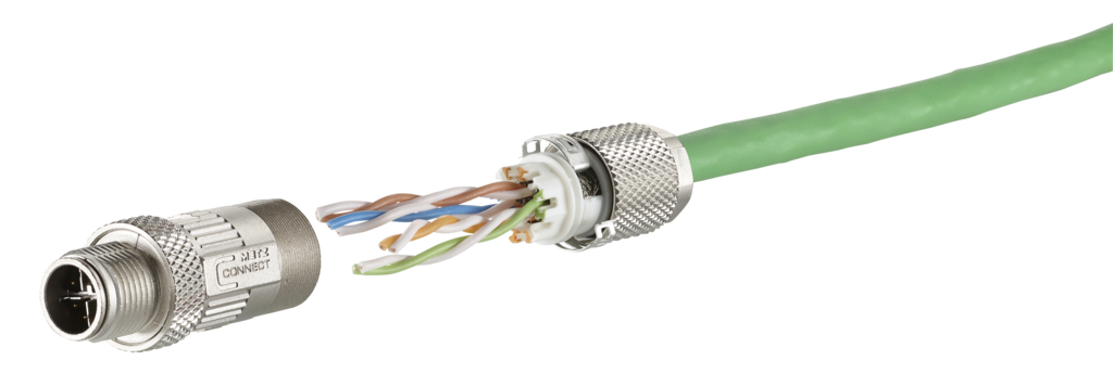 Feldkonfektionierbarer M12 Cat.6, A Stecker X-kodiert auf Basis IEC PAS 61076-2-109für 8-adrigen Kabelanschluss, für AWG 22, Anschluss von AWG 26/1 - 22/1, AWG 26/7 - 22/7 möglich, Leiterdurchmesser Cu-Volldraht 0,4 - 0,64 mm, Leiterdurchmesser Cu-Litze 0,48 - 0,76 mm, Aderdurchmesser bis 1,6 mm, Kabelmantel von 6,0 bis 9,7 mm, besteht aus nur 2 Teilen, einfachste Konfektion - ohne Spezialwerkzeug anzuschließen, industrietaugliches Zinkdruckgussgehäuse, geeignet für Anwendungen in der Bahnindustrie gemäß Datenblatt