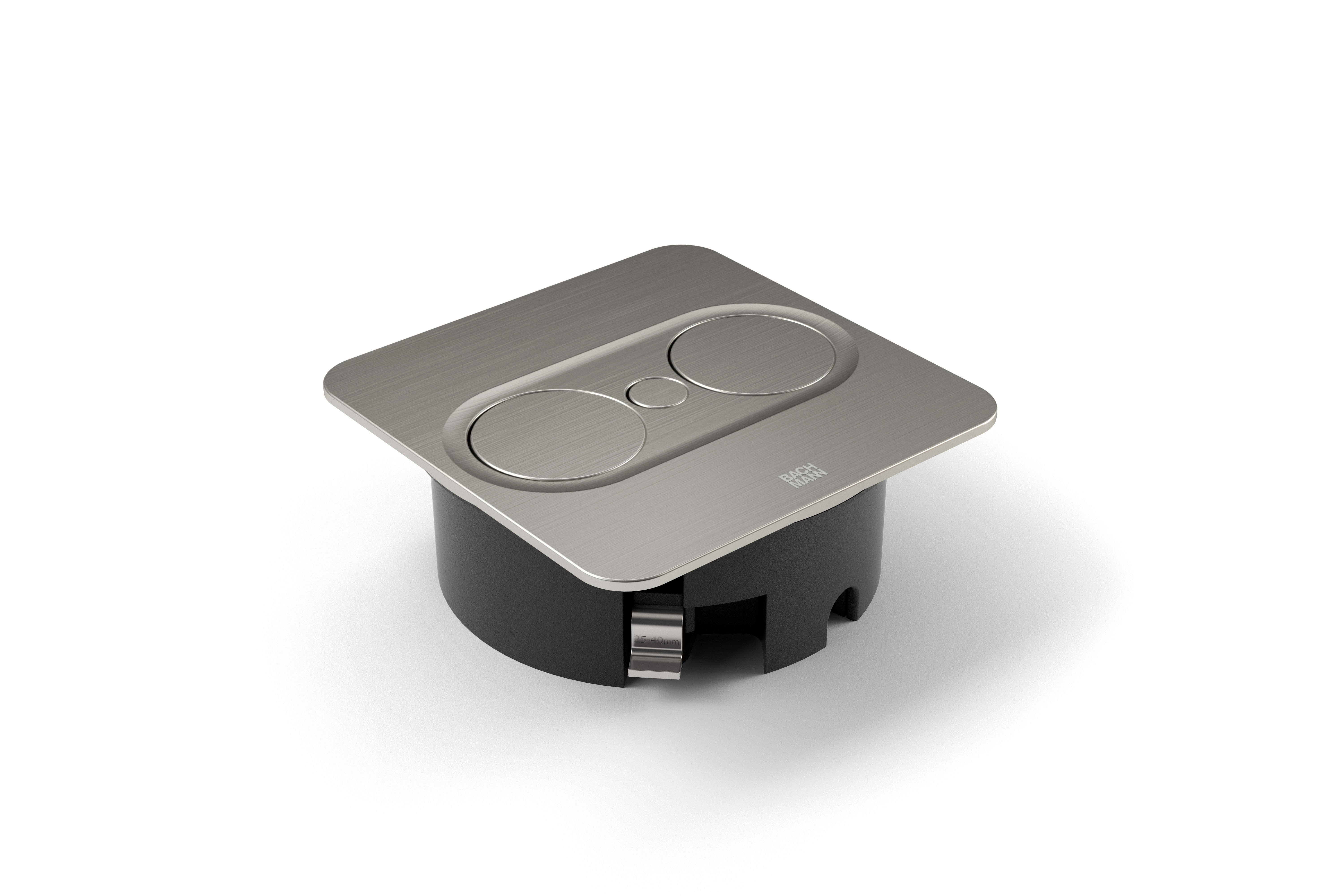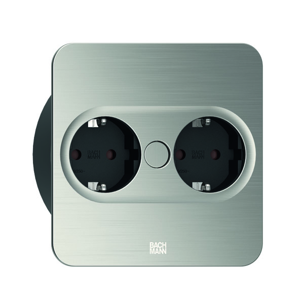 TWIST 2 Einbausteckdose mit metallischer Abdeckscheibe in Edelstahl-Optik eckig 2xSchutzkontaktsteckdosen schwarz mit erhöhtem Berührungsschutz Zuleitung 2,0m H05VV-F 3G1,5mm² schwarz mit Aderendhülsen und beigelegtem Schutzkontakt-Montagestecker verpackt im Karton