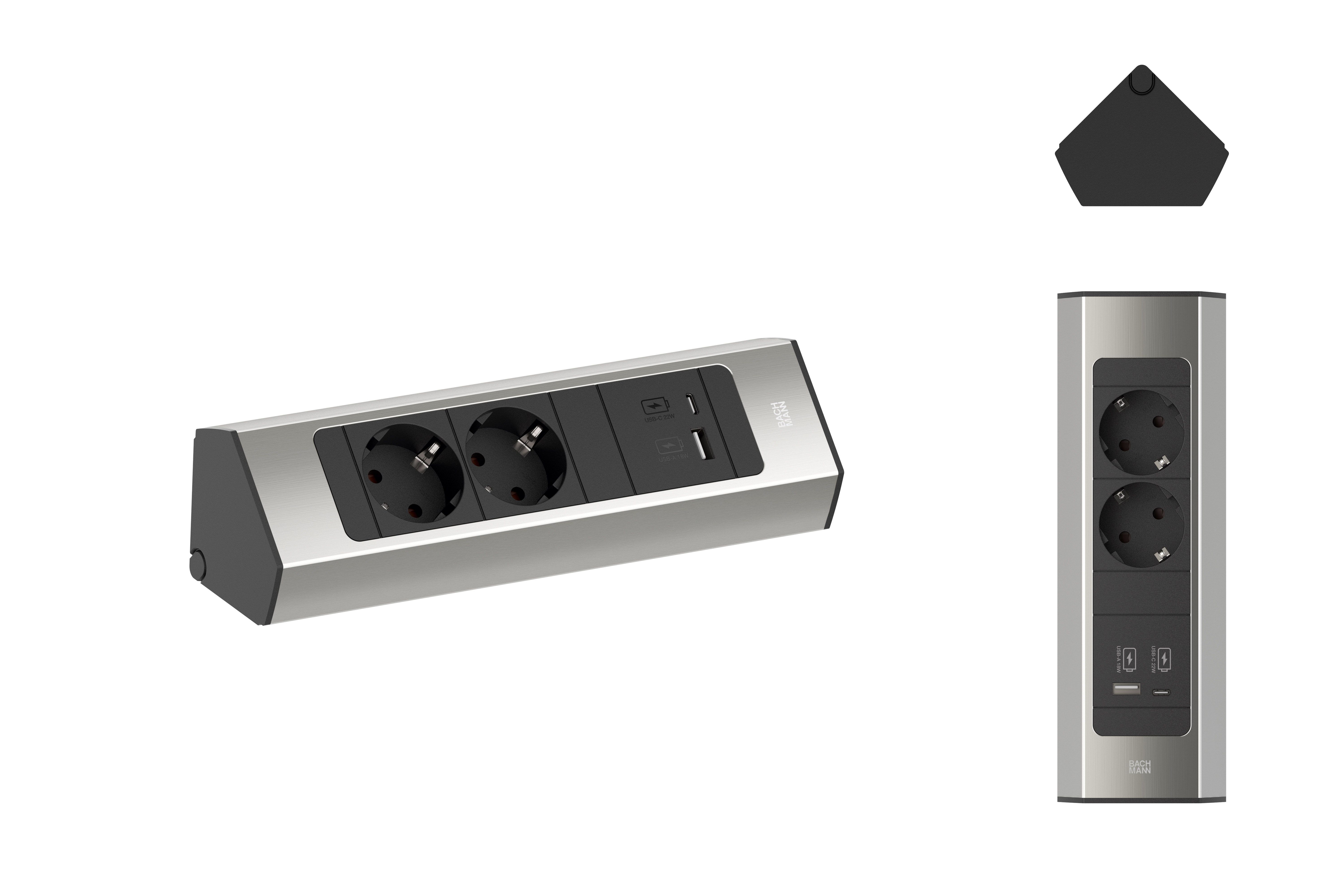 CASIA 2 Steckdosenleiste für Nischen- und Eckmontage, Aluprofil mit Blende in Edelstahl-Optik, 2xSchutzkontaktsteckdosen schwarz 35° mit erhöhtem Berührungsschutz, 1xUSB A/C 22W Charger Zuleitung: 2,0m H05VV-F3G1,5mm² schwarz mit Aderendhülsen und beigelegtem Schutzkontakt-Montagestecker verpackt im Karton mit POS Sleeve