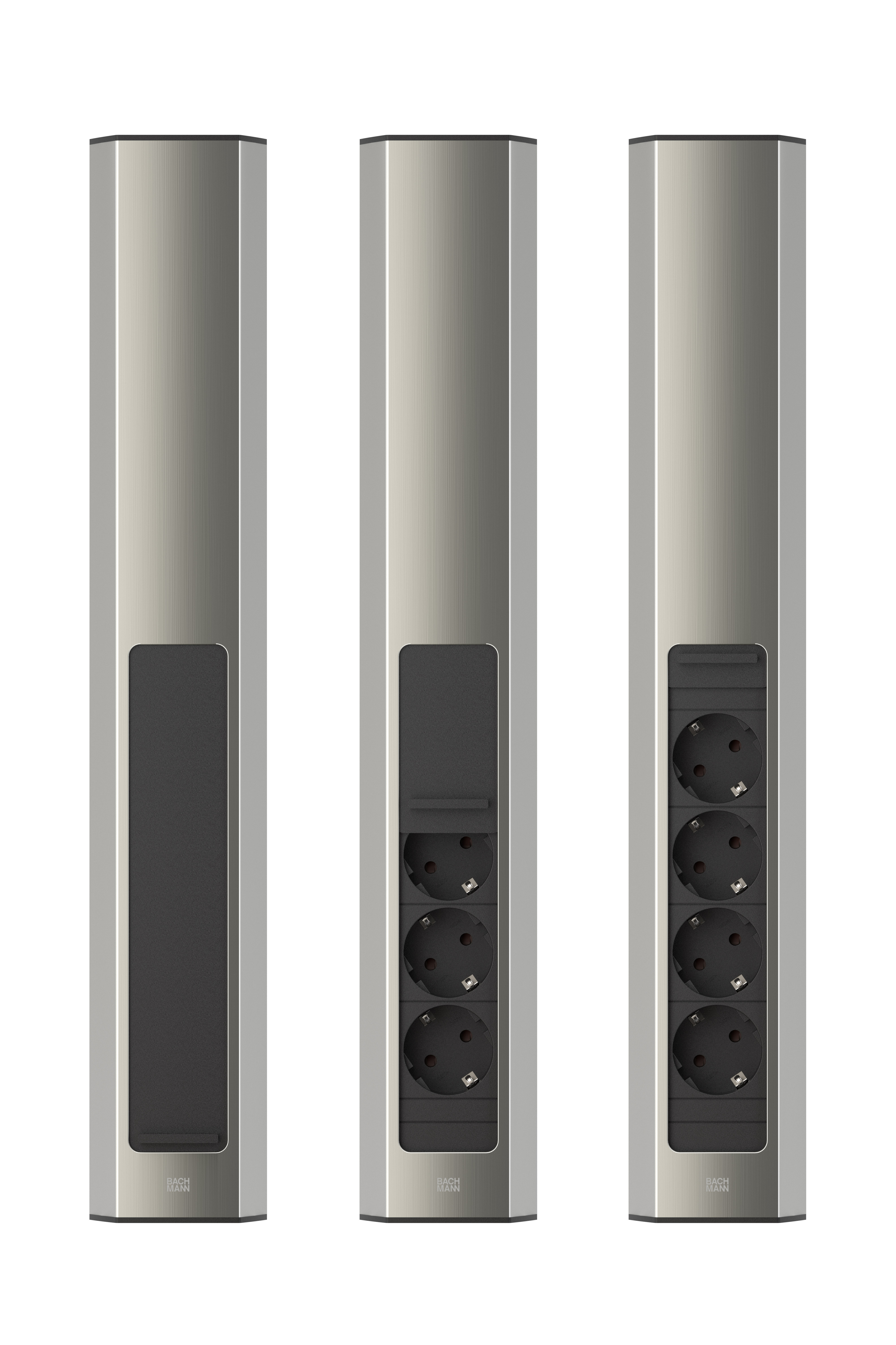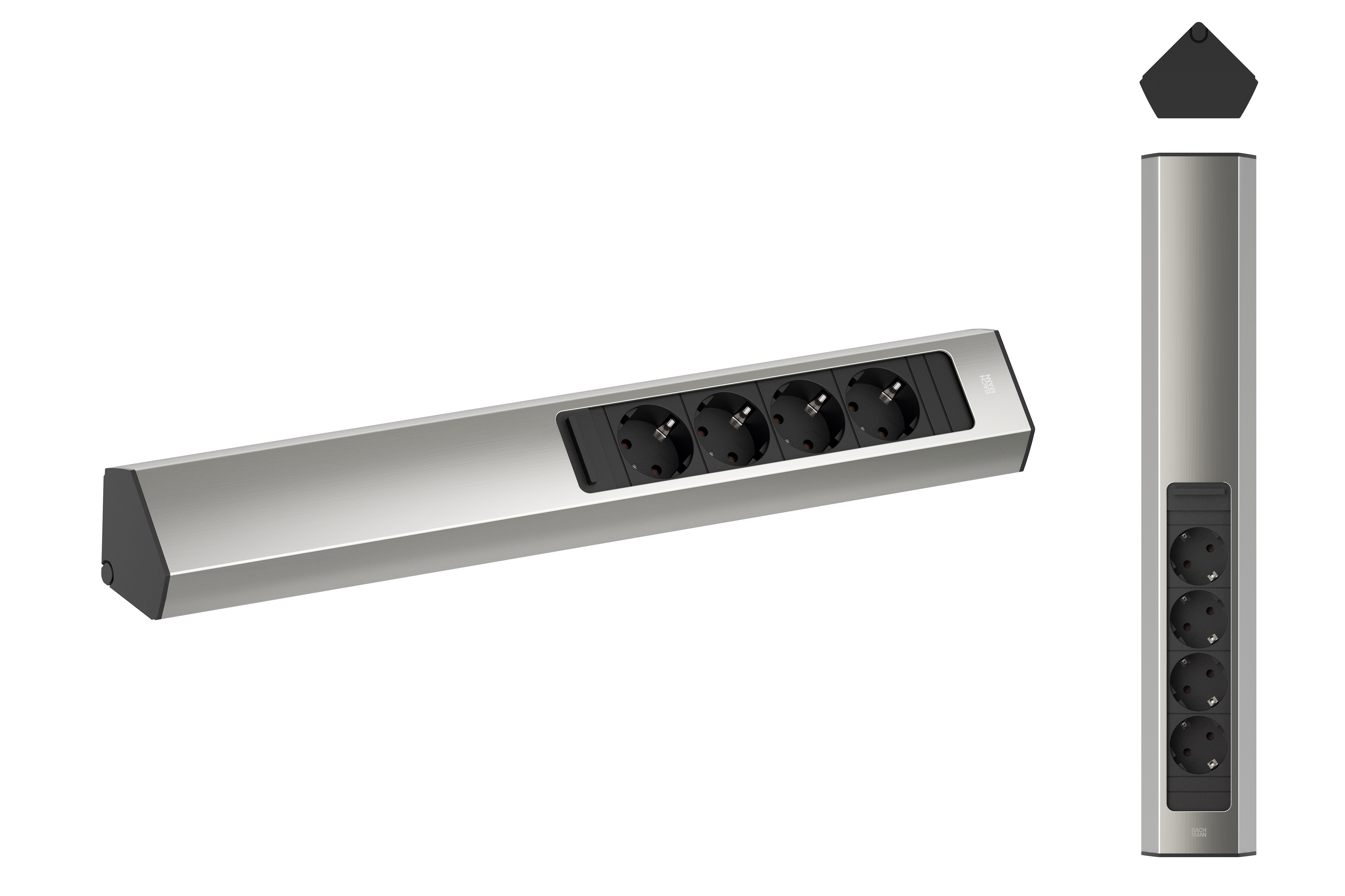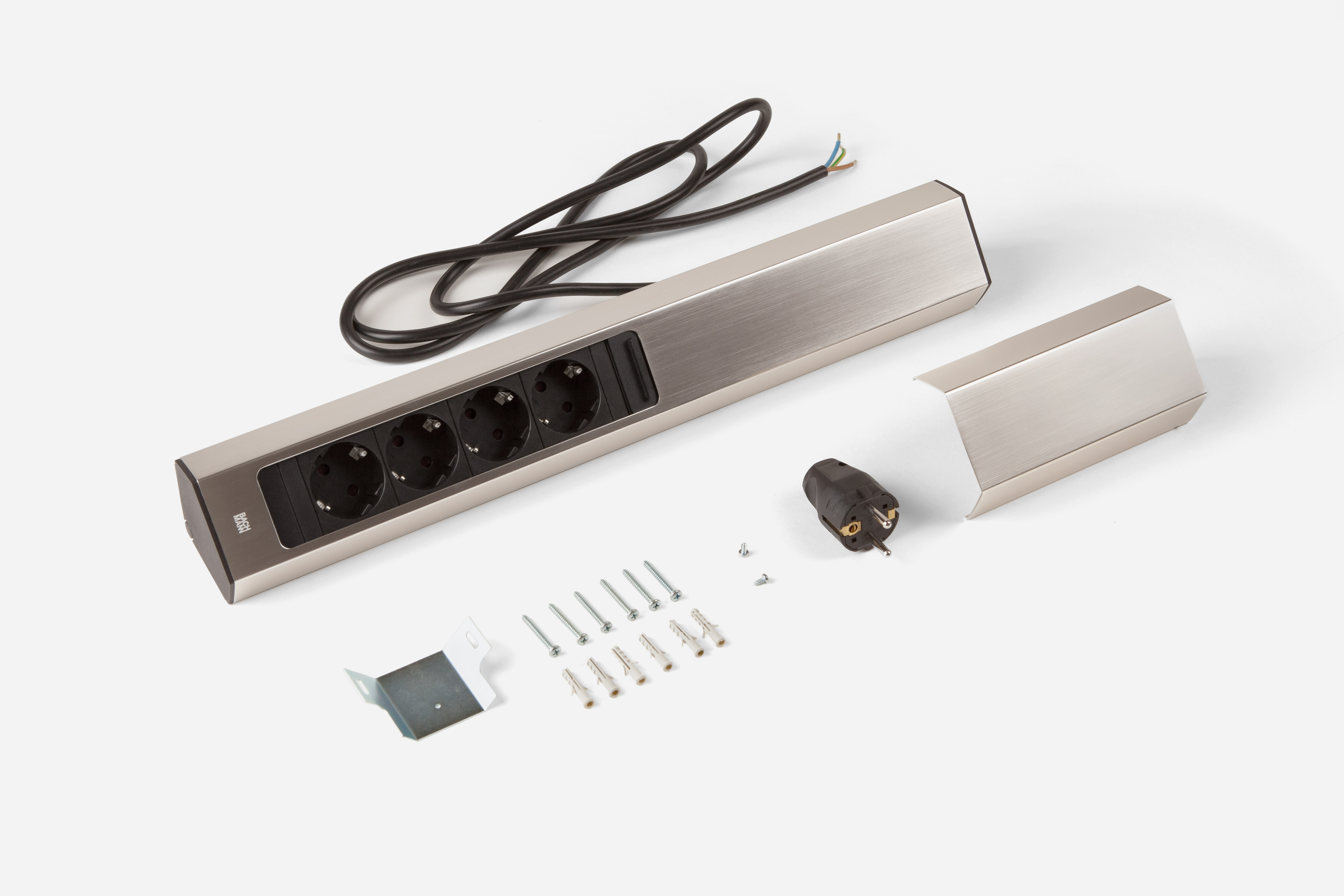 CASIA 2 Steckdosenleiste für Nischen- und Eckmontage, Aluprofil mit Blende in Edelstahl-Optik, 4xSchutzkontaktsteckdosen schwarz 35° mit erhöhtem Berührungsschutz, Zuleitung: 2,0m H05VV-F3G1,5mm² schwarz mit Aderendhülsen und beigelegtem Schutzkontakt-Montagestecker verpackt im Karton mit POS Sleeve