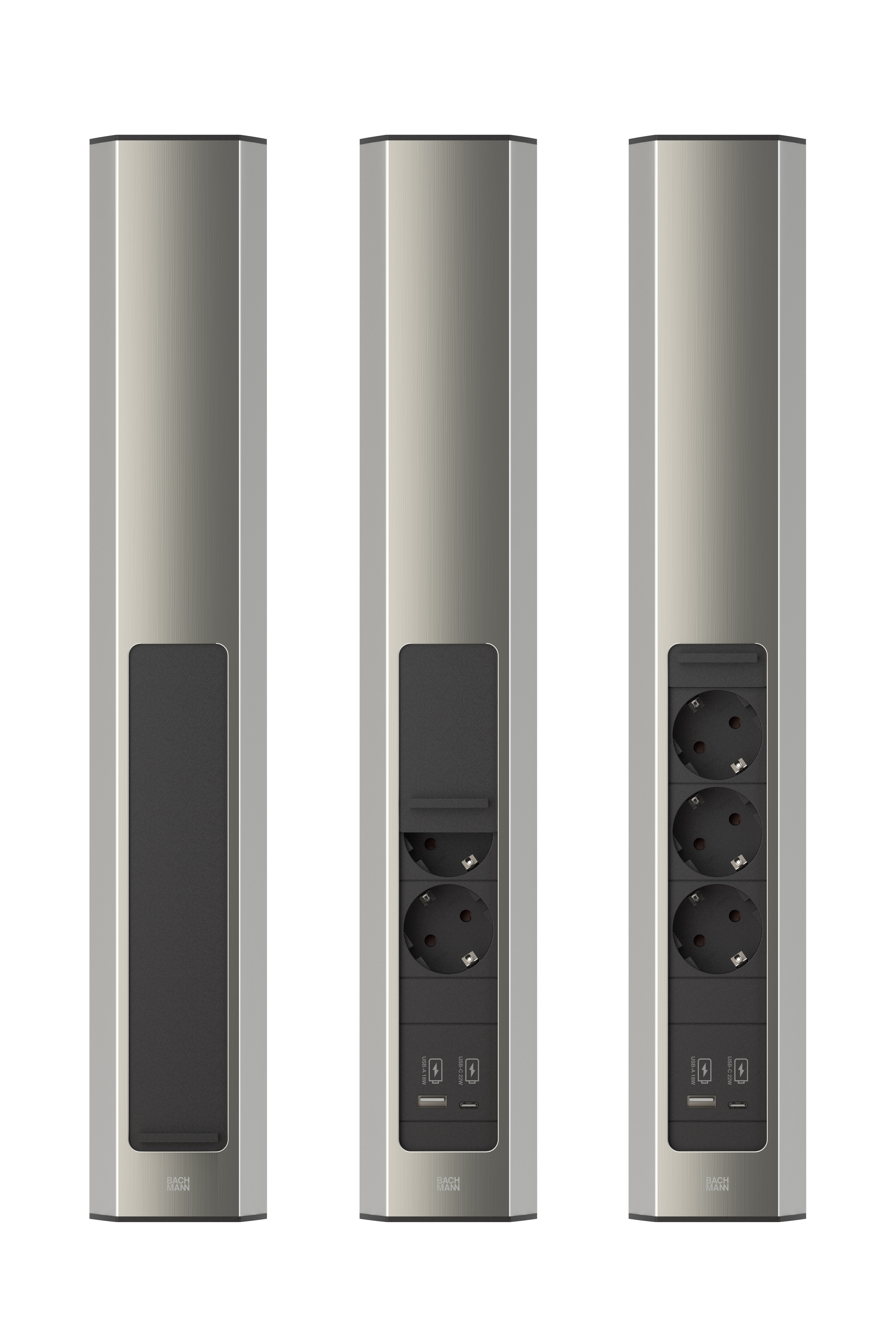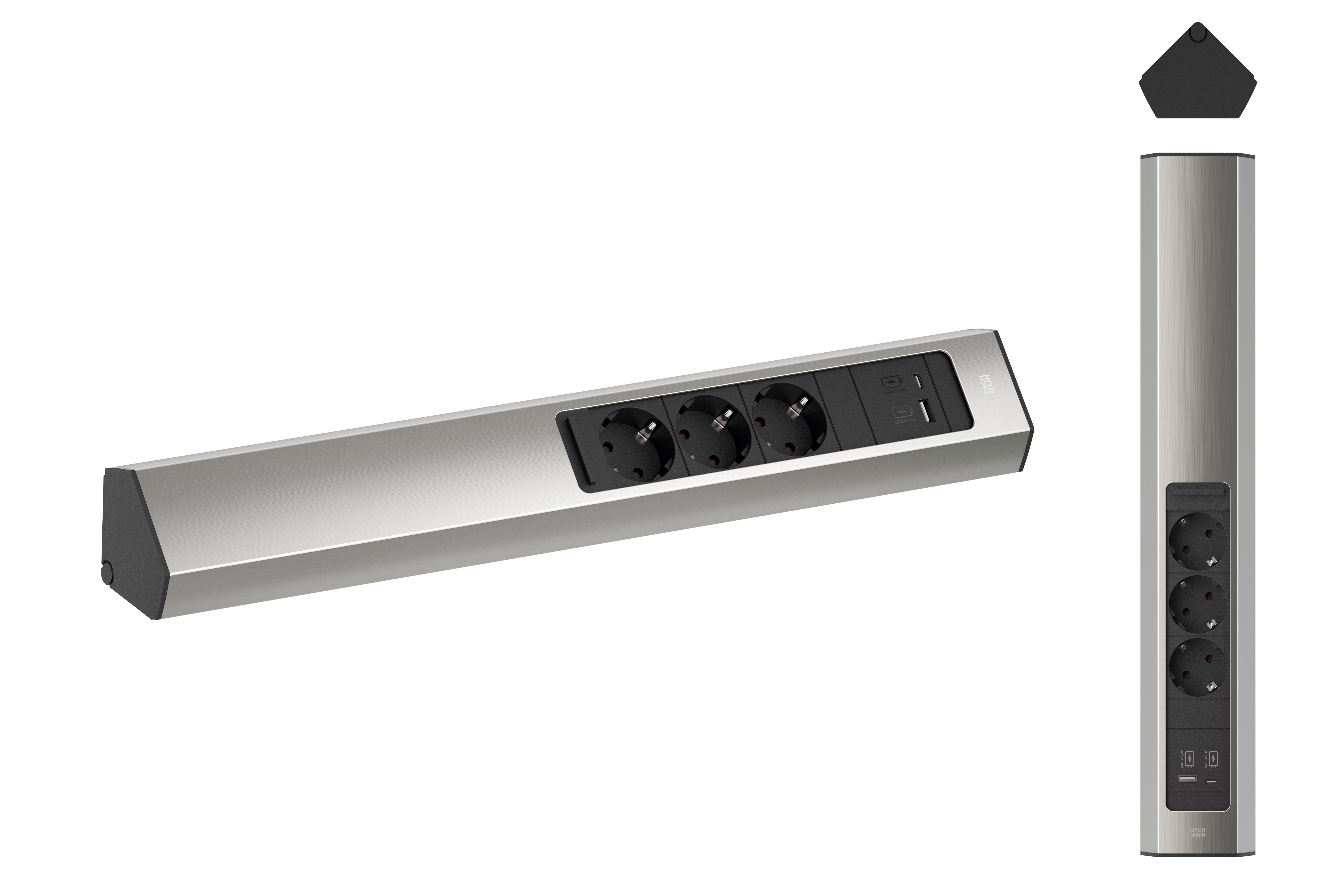 CASIA 2 Steckdosenleiste für Nischen- und Eckmontage, Aluprofil mit Blende in Edelstahl-Optik, 3xSchutzkontaktsteckdosen schwarz 35° mit erhöhtem Berührungsschutz, 1xUSB A/C 22W Charger Zuleitung: 2,0m H05VV-F3G1,5mm² schwarz mit Aderendhülsen und beigelegtem Schutzkontakt-Montagestecker verpackt im Karton mit POS Sleeve
