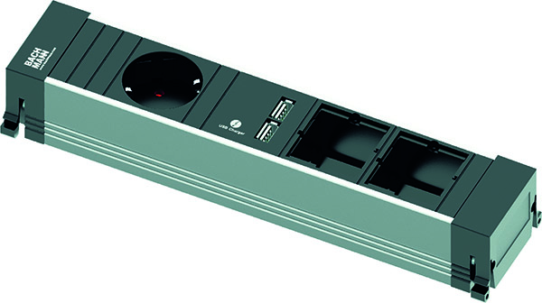 POWER FRAME Steckdosenleiste mit erhöhtem Berührungsschutz 1xSchutzkontaktsteckdosen schwarz, 1xUSB Doppelcharger 5V DC / 3,1A 2xCustom Modul leer, Stromeingang 0,2m H05VV-F3G1,5mm² mit Installationsstecker mit BACHMANN Logo Verpackung im Polybeutel.