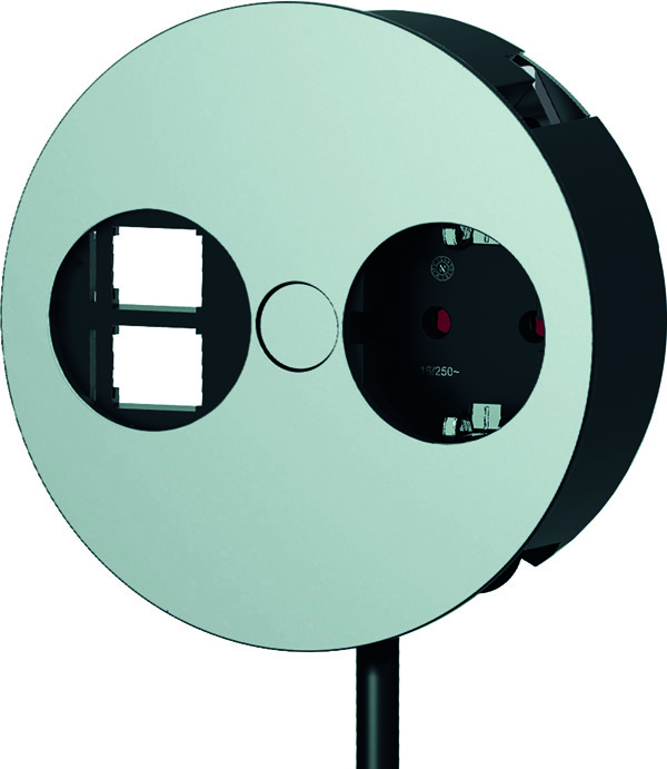 TWIST Einbausteckdose mit metallischer Abdeckscheibe in Chrom matt, 1xSchutzkontaktsteckdose schwarz mit erhöhtem Berührungsschutz, 2xKeystone für Datenbuchsen, Zuleitung 0,2m H05VV-F3G1,5mm² schwarz mit Installationsstecker schwarz, verpackt im Karton