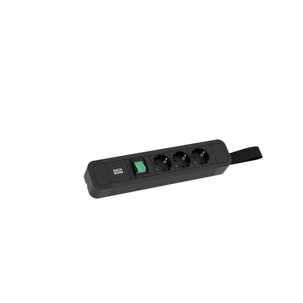 PRIMO 2 Steckdosenleiste Aluminiumprofil schwarz eloxiert 1xSchalter grün 3xSchutzkontaktsteckdosen 35° schwarz Schwarze Design-Endkappen mit Schlaufe zum Aufhängen Zuleitung: 2,0m H05VV-F 3G1,5mm² mit Schutzkontakt-Winkelstecker mit BACHMANN Logo verpackt im Karton