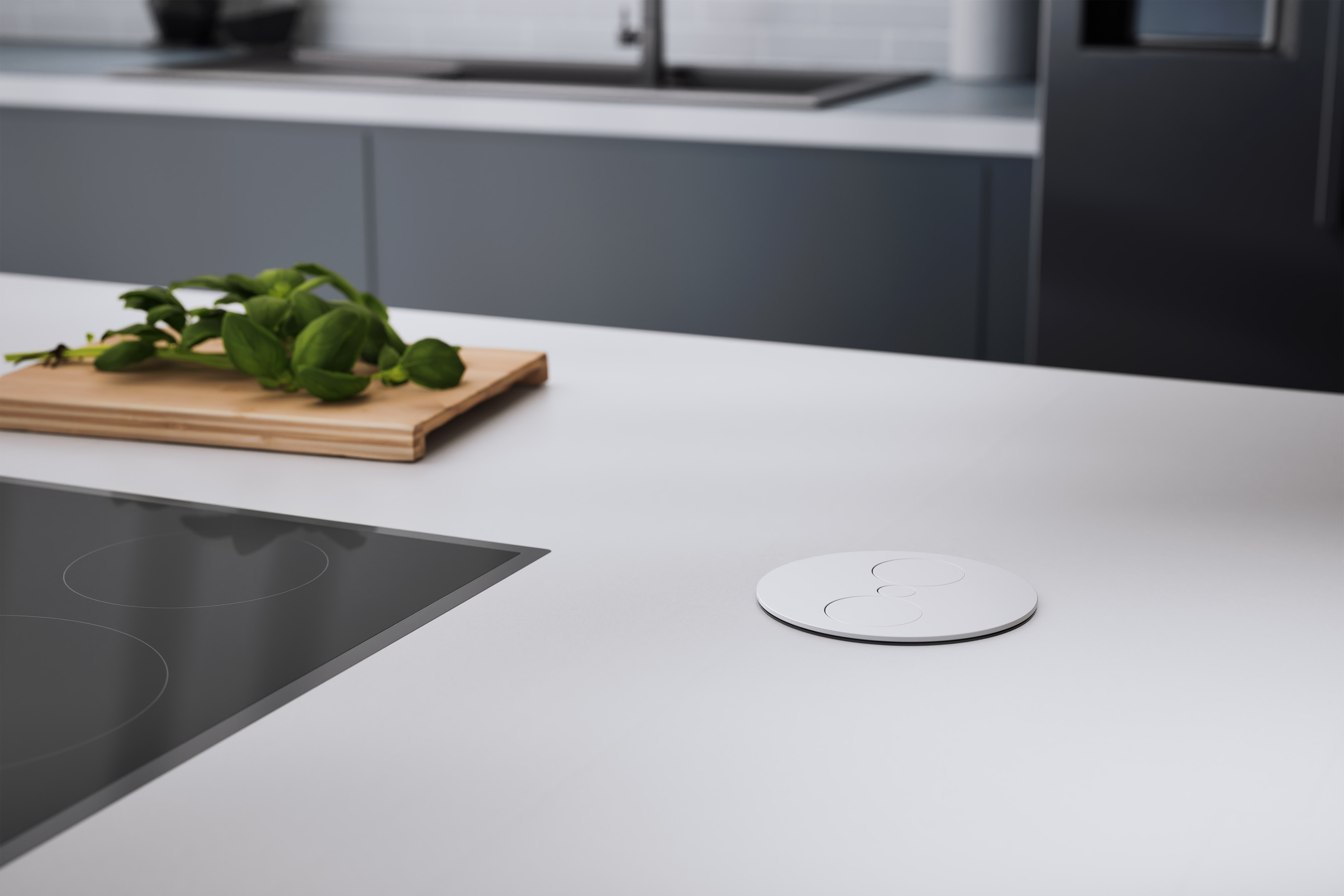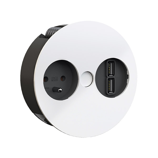 TWIST Einbausteckdose mit metallischer Abdeckscheibe in weiß 30GE ähnlich RAL9010, seidenmatt 1xUTE Steckdose Frankreich schwarz mit erhöhtem Berührungsschutz 1xUSB Doppelcharger 5V DC / 3,1A 2,0m H05VV-F3G1,5mm² schwarz mit Aderendhülsen und beigelegtem Schutzkontakt-Montagezentralstecker schwarz, verpackt im Karton