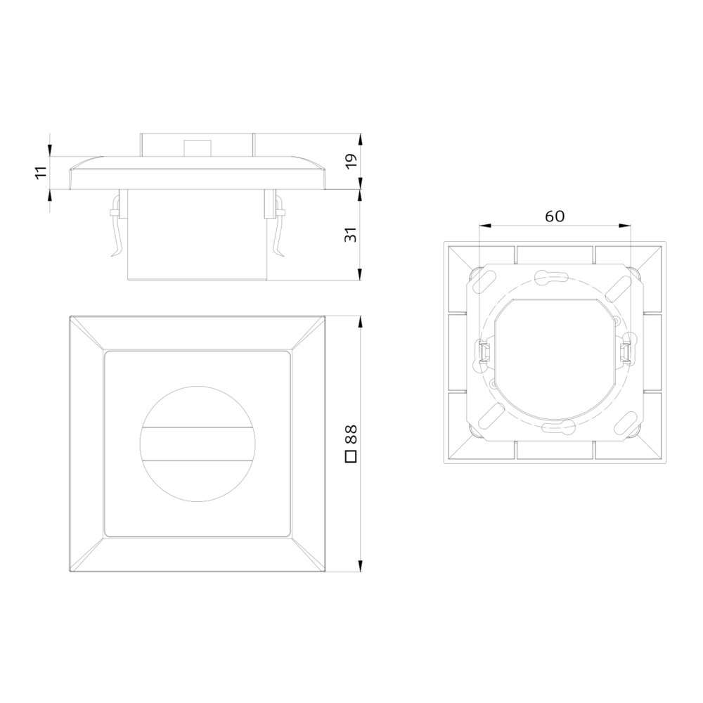 Wandpräsenzmelder mit integriertem Taster, Ein Kanal zum Schalten von Licht (wahlweise Haupt- oder Orientierungslicht), Integriertes Downlight mit Orientierungs- und Nachtlichtfunktion, Erweiterung des Erfassungsbereiches mit bis zu 5 weiteren Indoor 140-L möglich, Kann sowohl als Master-Gerät als auch als Slave-Gerät genutzt werden, Relais mit Wolfram-Vorlaufkontakt, optimiert für LED-Lasten, Verfügbar mit Rahmen (Maß Innenabdeckung 60 x 60 mm) oder ohne Rahmen zur Kombination mit Abdeckrahmen (Maß Innenabdeckung 50 x 50 mm) in 4 verschiedenen Farben, Rahmen für Art.-Nr. 94325 müssen separat bestellt werden, verfügbar in verschiedenen Farben, In Verbindung mit Zentralplatten einsetzbar in gängige Rahmensysteme verschiedener Hersteller, B.E.G.-Abdeckrahmen und Zentralplatten zur Kombination mit anderen Rahmensystemen verfügbar