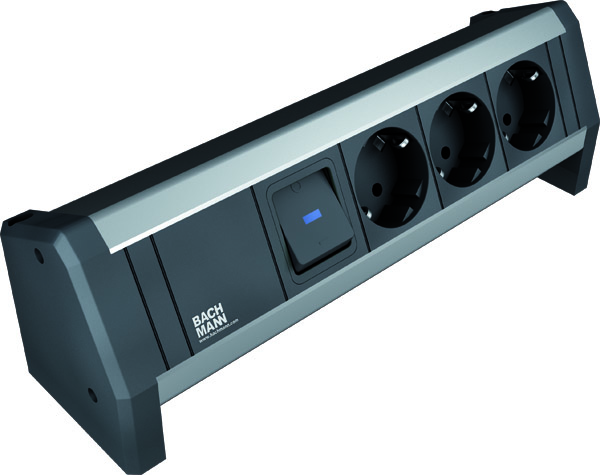 DESK Steckdosenleiste mit erhöhtem Berührungsschutz 1xSchalter 2-polig, blau beleuchtet, schaltet Steckdosen, nicht Stromausgang, 3xSchutzkontaktsteckdose schwarz Stromein- und ausgang: Installationssteckverbinder ohne Haltewinkel, ohne Stromzuleitung,