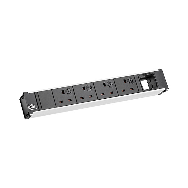 CONI Steckdosenleiste mit erhöhtem Berührungsschutz 4xUK 90° Steckdosen 3,15A schwarz 1xCustom Modul leer Stromeingang: 0,2m H05VV-F 3G1,5mm² schwarz mit Installationsstecker mit BACHMANN Logo verpackt im Karton