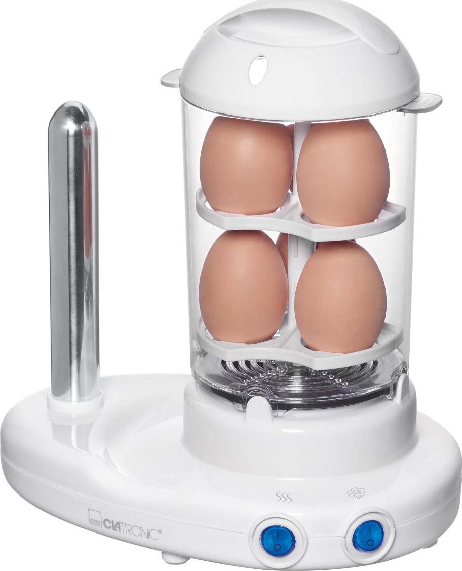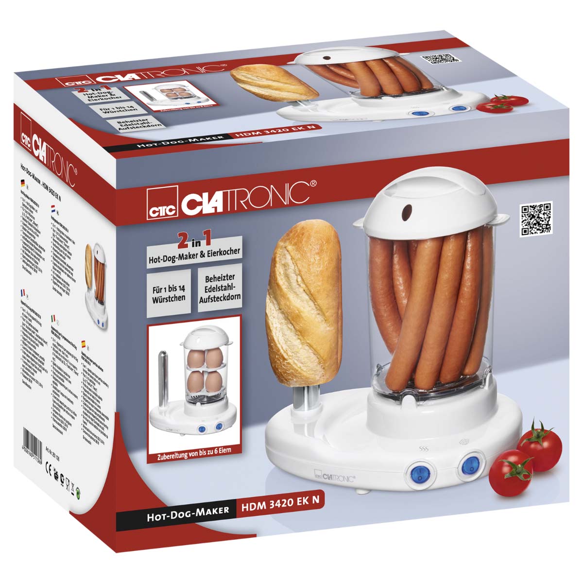 2 in 1 Hot-Dog-Maker und Eierkocher in einem, für 1 bis 14 Würstchen (z. B. "Frankfurter", "Wiener"), beheizter Edelstahl-Aufsteckdorn, Zubereitung von bis zu 6 Eiern, Eihalter herausnehmbar, transparenter Dampfbehälter, abnehmbar, Antihaftbeschichtete Wasserschale, 2 separate Schalter für Aufsteckdorn und Dampfbehälter (blau beleuchtet), inkl. Messbecher mit Eipicker