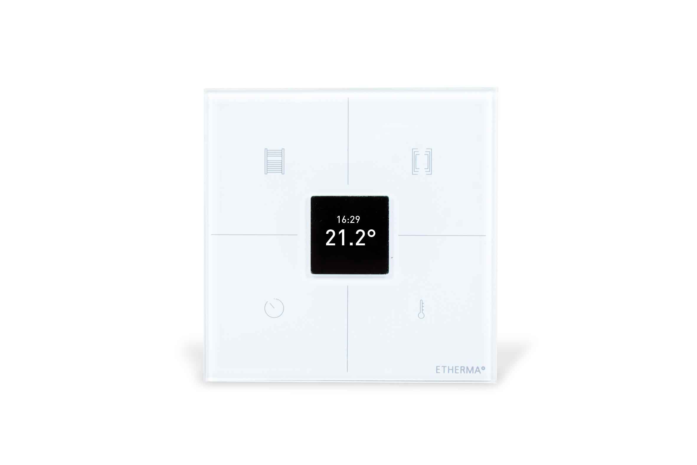 eTOUCH hybrid ist das neueste Design-Einbauthermostat von ETHERMA, das sich durch die energieeinsparende Selbstlernfunktion, besondere Bedienerfreundlichkeit und das elegante Infinity Design auszeichnet. Der Regler verfügt über ein hochwertiges LED-Glas-Touchdisplay und kann dank zwei Relaisausgängen gleichzeitig 2 Heizungen steuern - jeweils wahlweise mit Timerfunktion (bis zu 3h) oder Wochenprogrammierung . Es ist zudem Ökodesign-Richtlinien konform. Farbe: weiß, Maße: 90x90 mm, Temperaturbereich: 18-27 °C, Schaltstrom: 16 A total, Spannung: 230 V, Gangreserve: Zeiteinstellung 3 min., Montage: auf UP-Schalterdose, Schutzart: IP 21, Prüfzeichen: CE konform. Dieser Regler erfüllt folgende Regelungsfunktionen: TW (f4)