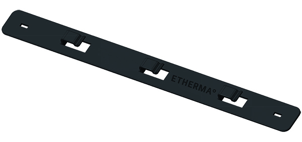 An den Ecken abgerundeter Distanzhalter aus Kunststoff zur speziellen Verwendung für Heizbänder bei Doppelverlegung auf Foliendächern und zur Befestigung auf Dächern, für bis zu 3 Heizbänder, UV-beständig, über einfaches Befestigungssystem untereinander verbindbar.