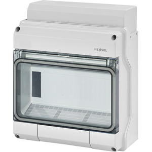 Kleinverteiler aus hochwertigem Thermoplast (Polystyrol). Für Aufputz-Anwendungen in Gebäuden oder der geschützten Installation im Freien. Automatengehäuse, mit 9 Teilungseinheiten, zum Einbau von Geräten mit Schnappbefestigung auf DIN-Tragschiene. Kabeleinführung über integrierte elastische Dichtmembranen. Mit transparenter Klappe, Kabeleinführungsblende und ausbrechbarem Geräteausschnitt. Schutzart IP 54.