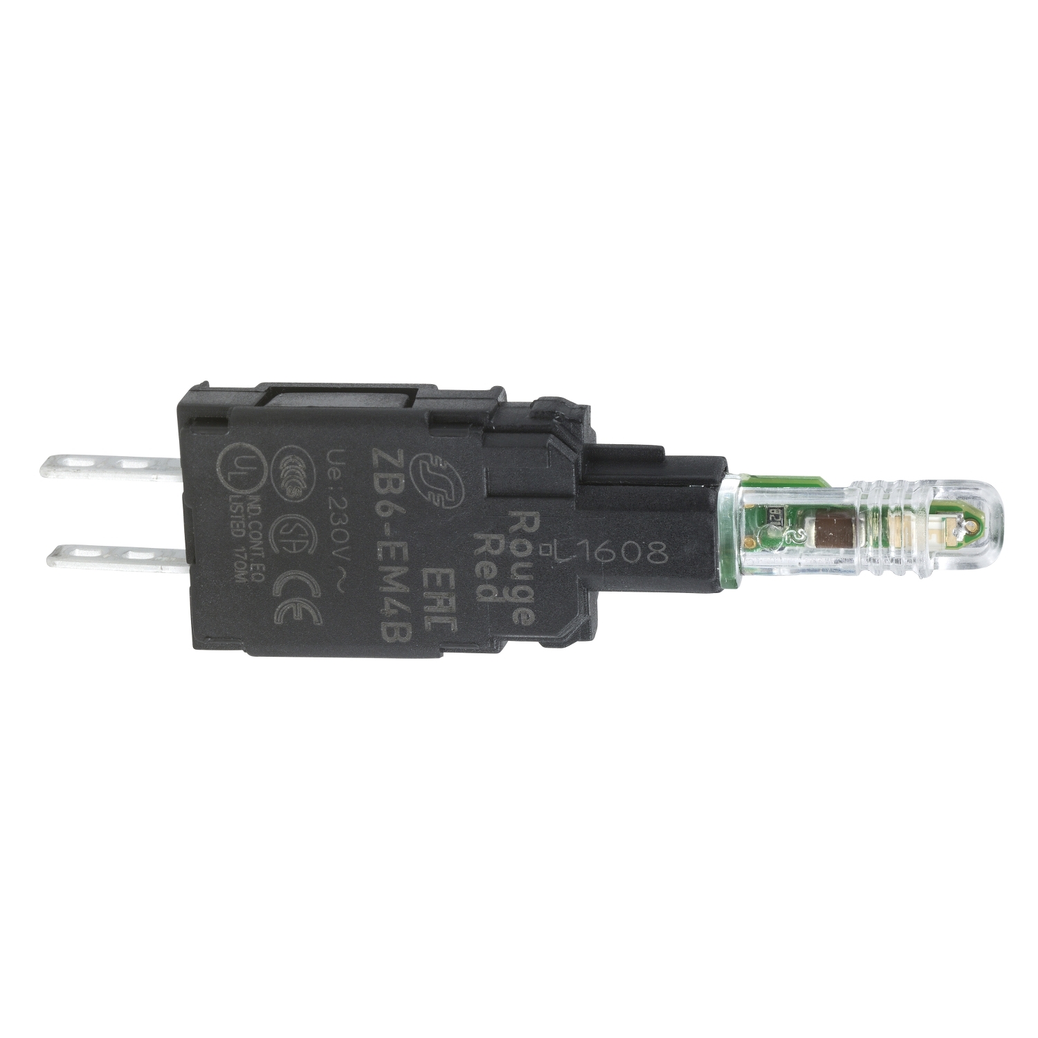 Roter Lampenfassung mit Karosserie/Befestigungsmanschette mit integrierter LED 230 V bis 240 V. Es ist Teil der Baureihe Harmony XB6 mit einem Durchmesser von 16 mm, kompakte Kunststoffdrucktaster, Schalter und Leuchtmelder.