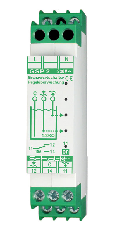 Der Grenzwertschalter GSP 2 dient zur Pegelstandsüberwachung leitender Flüssigkeiten. In Verbindung mit 3 Tauchelektroden kann ein minimaler und ein maximaler Flüssigkeitspegel überwacht werden. Über den potentialfreien 10A Wechselkontakt kann mit dem GSP 2 ein automatisiertes Befüllen oder Entleeren angesteuert werden. Die Sensoren werden über eine intern erzeugte Spannung von 5V AC (PELV) versorgt. Passende Sensoren: SP 1, SP 3 (passend für 1 oder 3 Elektroden, Elektroden nicht im Lieferumfang)., Maße: 18 x 55mm, 230V AC