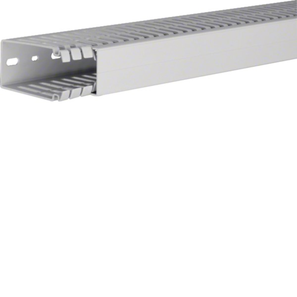 Der Verdrahtungskanal HA7 80x40mm in Lichtgrau ist halogenfrei und entspricht der DIN EN 50085. Er verfügt über ein Unterteil mit Seitenstanzung und ausbrechbaren Stegen, die eine flexible Kabelführung ermöglichen. Die integrierte Drahthalteklammer erleichtert die Installation. Das System ist ideal für eine sichere und geordnete Verkabelung in Elektroinstallationen.