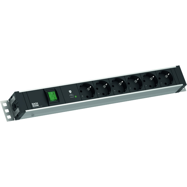 19" 1,5HE Steckdosenleiste Länge: ca. 440mm, 6xSchutzkontaktsteckdosen 35° weiß 1xSchalter grün 1xÜberspannungsschutz-Plus Endstücke genietet, nicht öffenbar, Zuleitung 2,0m H05VV-F3G1,5mm² weiß mit Schutzkontaktwinkelstecker, mit BACHMANN Logo inkl. Haltewinkel verpackt im Karton
