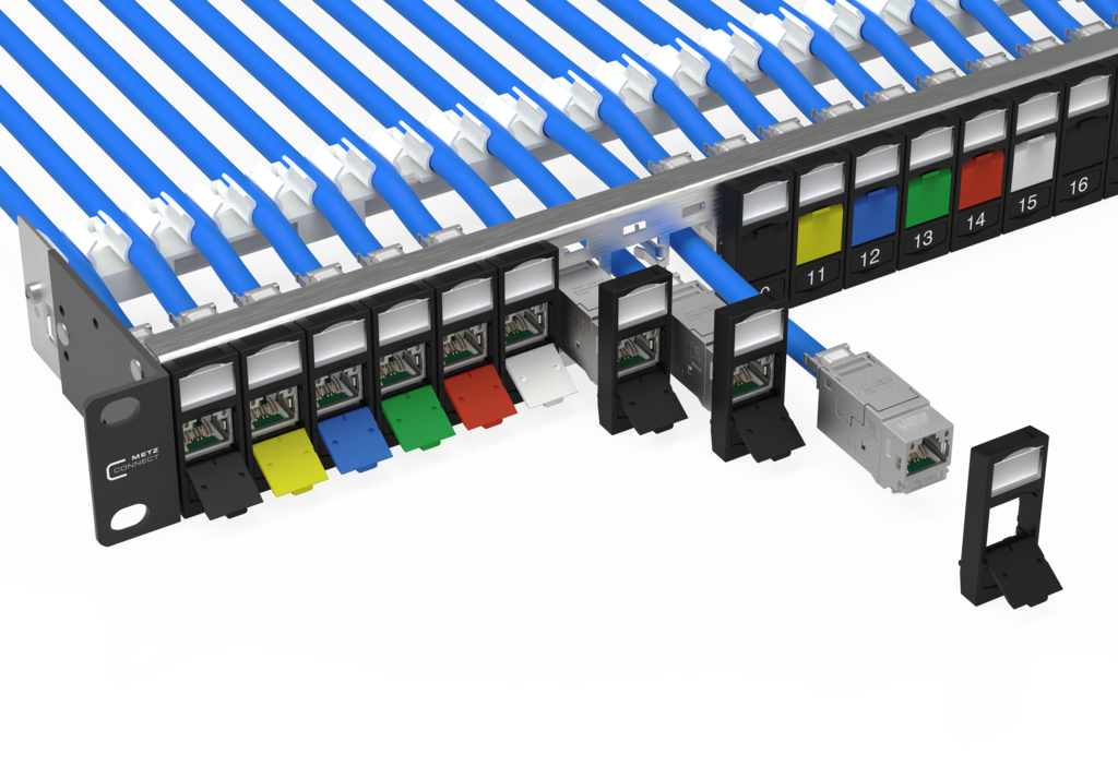 19 Zoll 1HE Modulträger für 24 Einzelmodule in Keystonebauform, Modulträgerfront aus schwarz eloxiertem Aluminium, Modulhalter aus Kunststoff mit Staubschutzklappen (weitere Farben als Zubehör erhältlich) nach vorne entnehmbar, integrierte Kabelabfangung, zusätzliche Zugentlastung möglich, Sichtfenster für Beschriftungseinlage, Beschriftungsbogen 210 x 297 mm siehe Zubehör, Erdungsbolzen M6 x 10 mit Mutter und Zahnscheibe, inkl. 30 cm Erdungskabel, alle vollgeschirmten Module mittels Erdungsschiene verbunden