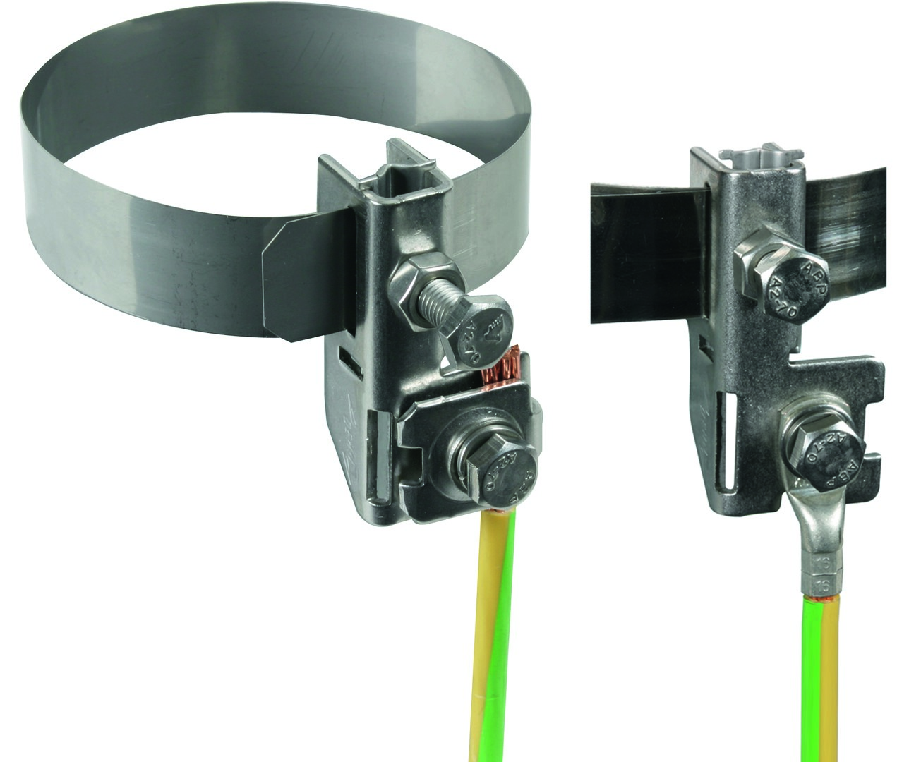Bandrohrschelle gegen selbstlockern gesischert, nach DIN EN 62561-1, zum Einbinden von Rohren in den Schutz und Funktionspotentialausgleich nach DIN VDE 0100 Teil 410/540 und den Blitzschutz-Potentialausgleich nach DIN EN 62305-3 (VDE 0185-305-3). Ausführung komplett mit stetig verstellbarem Spannband aus NIRO, zum Anschluss von 1 Leiter Rd D10 mm oder 1-2 Leiter Rd D6-8 mm oder 4-50 mm² (ein- / mehrdrähtig).